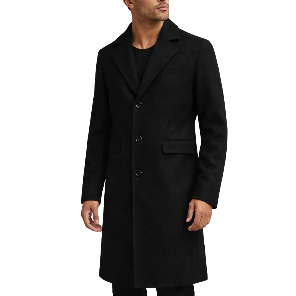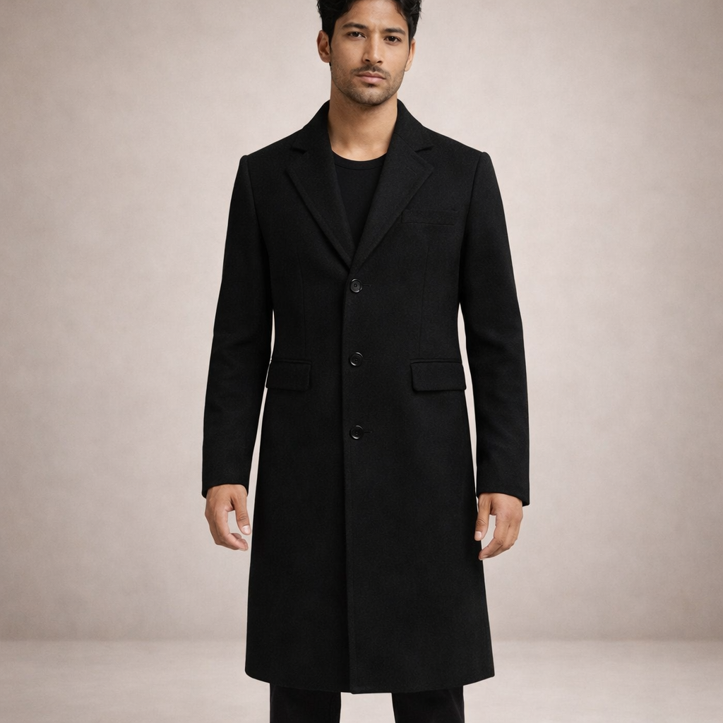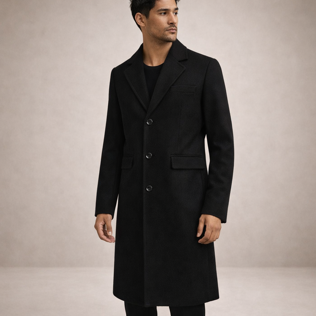 This longline overcoat presents a sharp, minimalist look with a timeless tailored silhouette, ideal for refined cold-weather dressing. Designed for effortless sophistication, it transitions seamlessly from weekday wear to evening occasions.