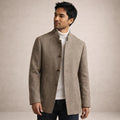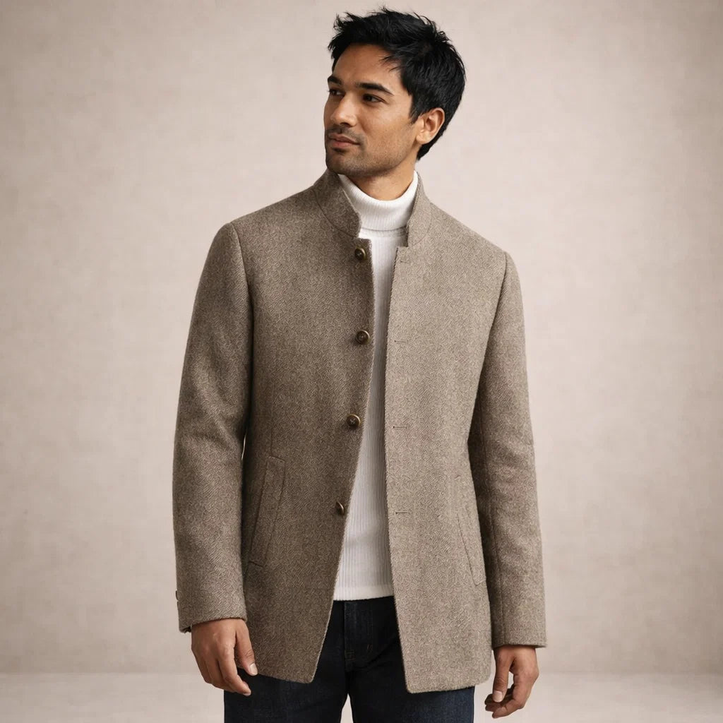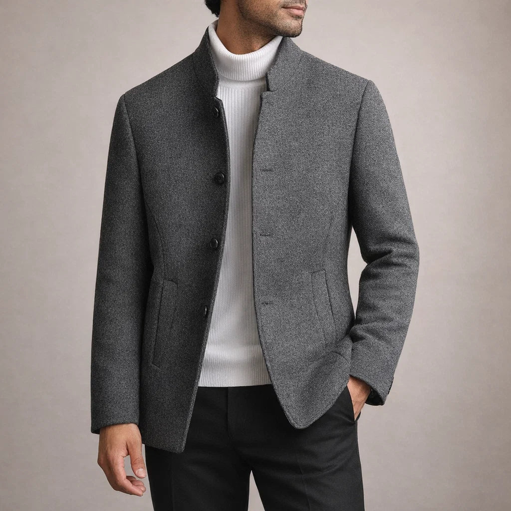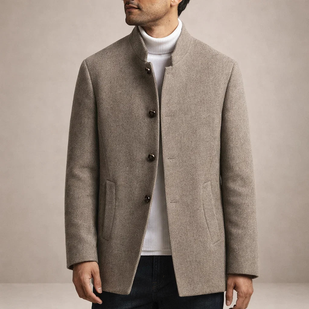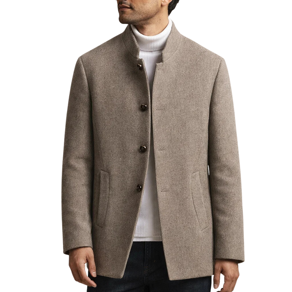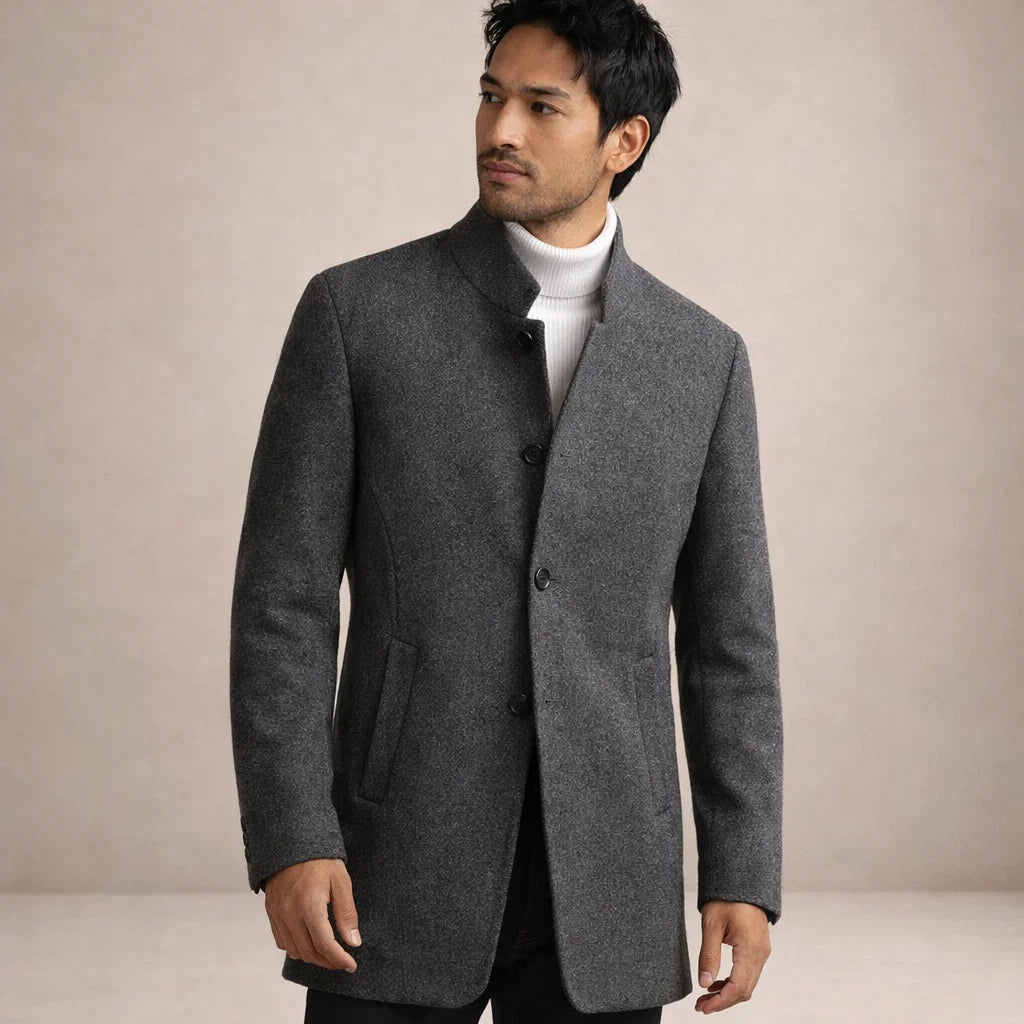 Men’s Tailored Wool Blend Coat with Stand Collar and Button Front