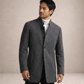 This men’s tailored coat is designed with a structured silhouette and a stand collar. The front features a visible button fastening, and the coat is constructed from a wool-blend fabric with a smooth, slightly textured appearance. Long sleeves and a clean, minimal exterior design are visible, with pockets positioned at the hip area.