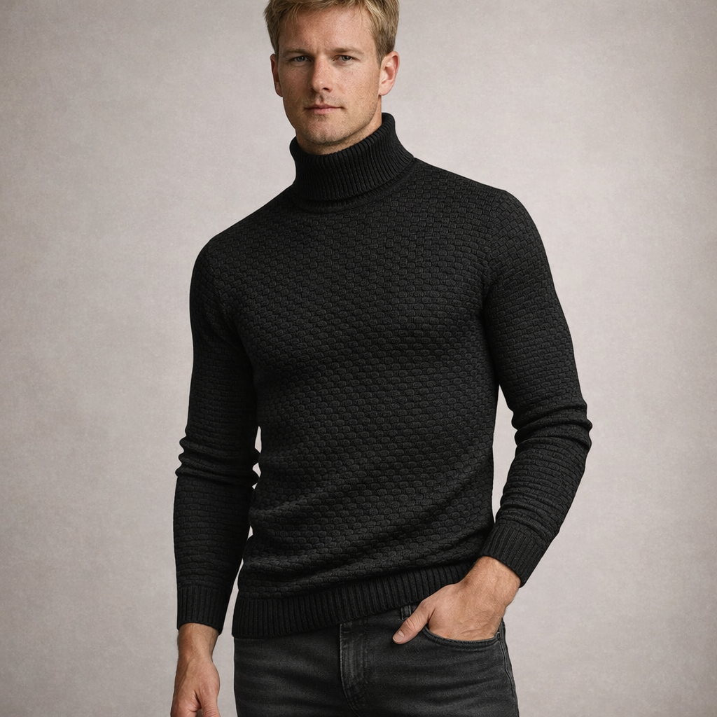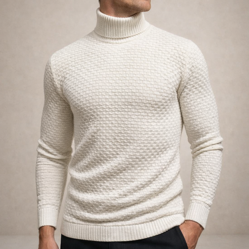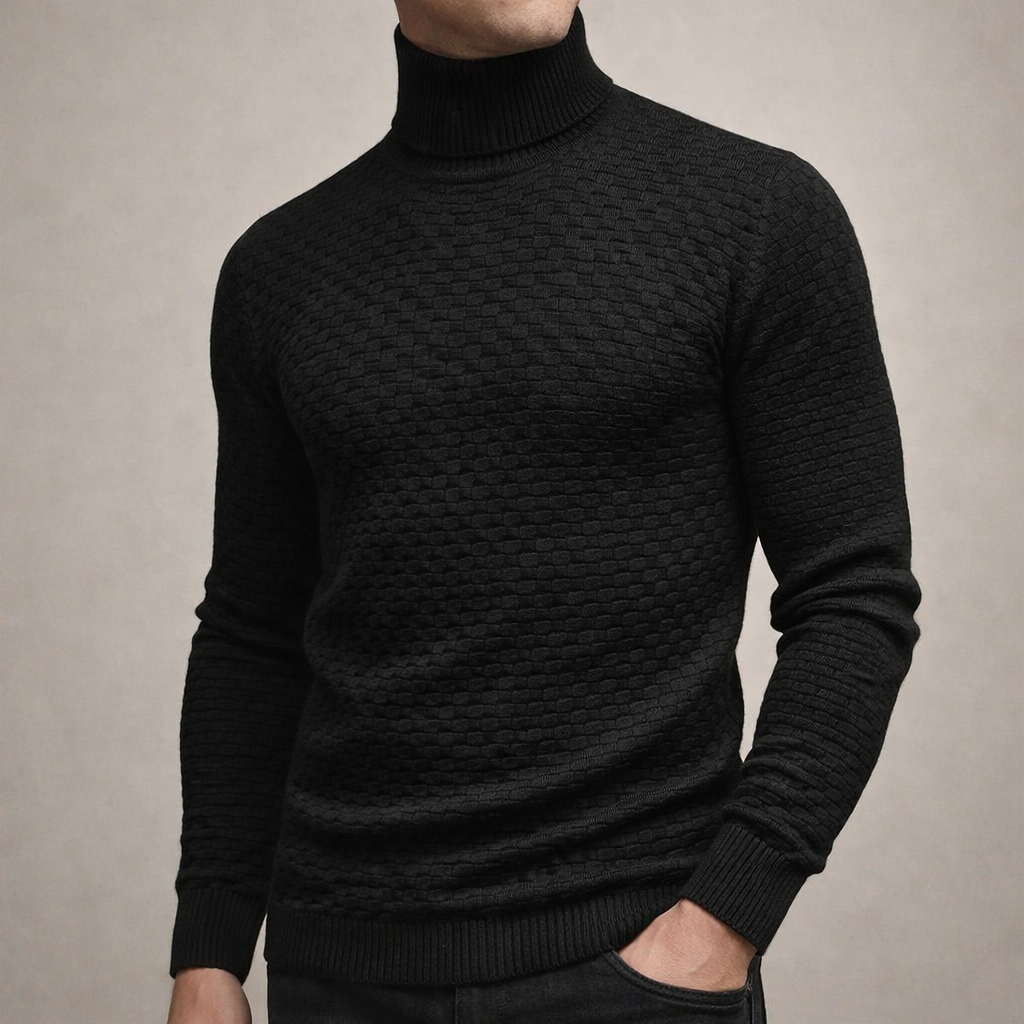 Design: Classic turtleneck with a distinctive grid-like textured pattern