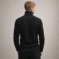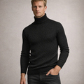 This black turtleneck sweater is a refined choice for the colder months, combining understated elegance with modern texture. Its sleek silhouette and versatile design make it ideal for both casual layering and smart-casual occasions, ensuring effortless style across different settings.