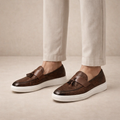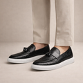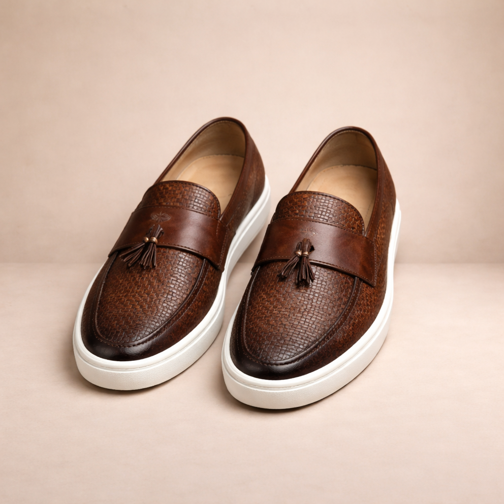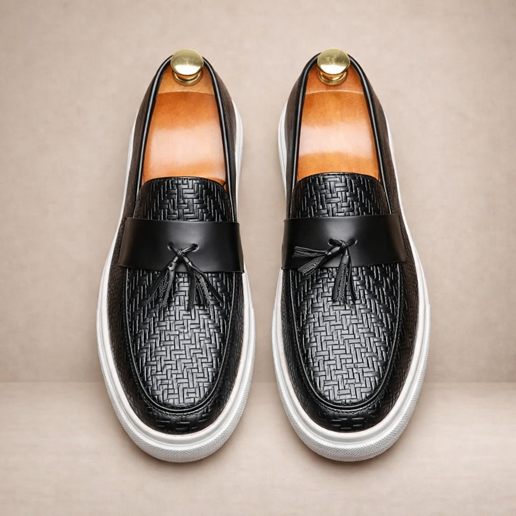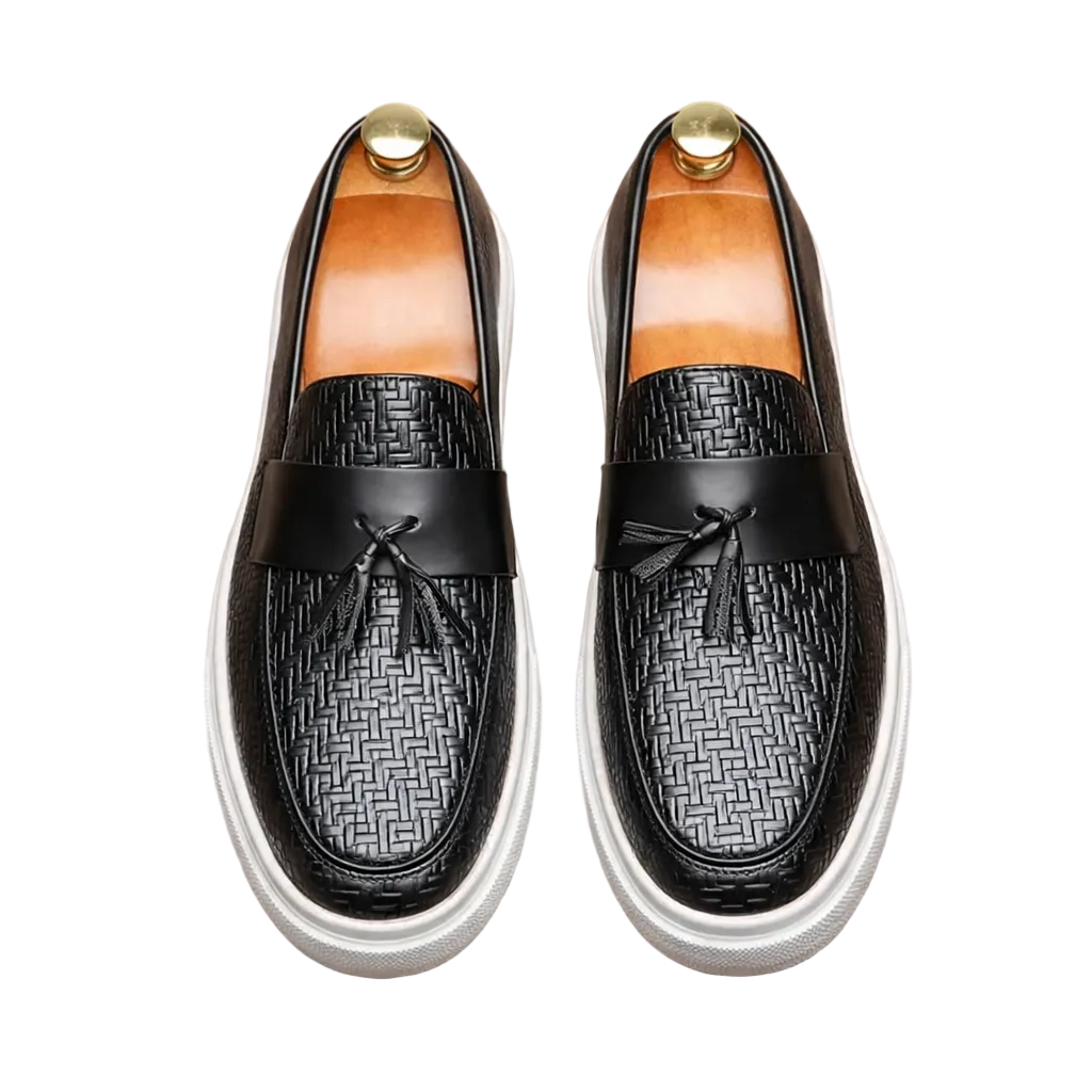 These men’s woven loafers deliver a refined business-casual look with modern comfort. The textured woven upper and minimalist bow detail create a polished appearance suitable for both professional and smart-casual settings.