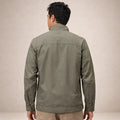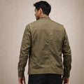 This men’s jacket features a clean, structured design with a full-length zip fastening at the front. The jacket has a stand collar and long sleeves with adjustable buttoned cuffs. Seam detailing is visible across the chest and sleeves. Side pockets are positioned at the hip area, and the outer fabric has a smooth, solid colour appearance.