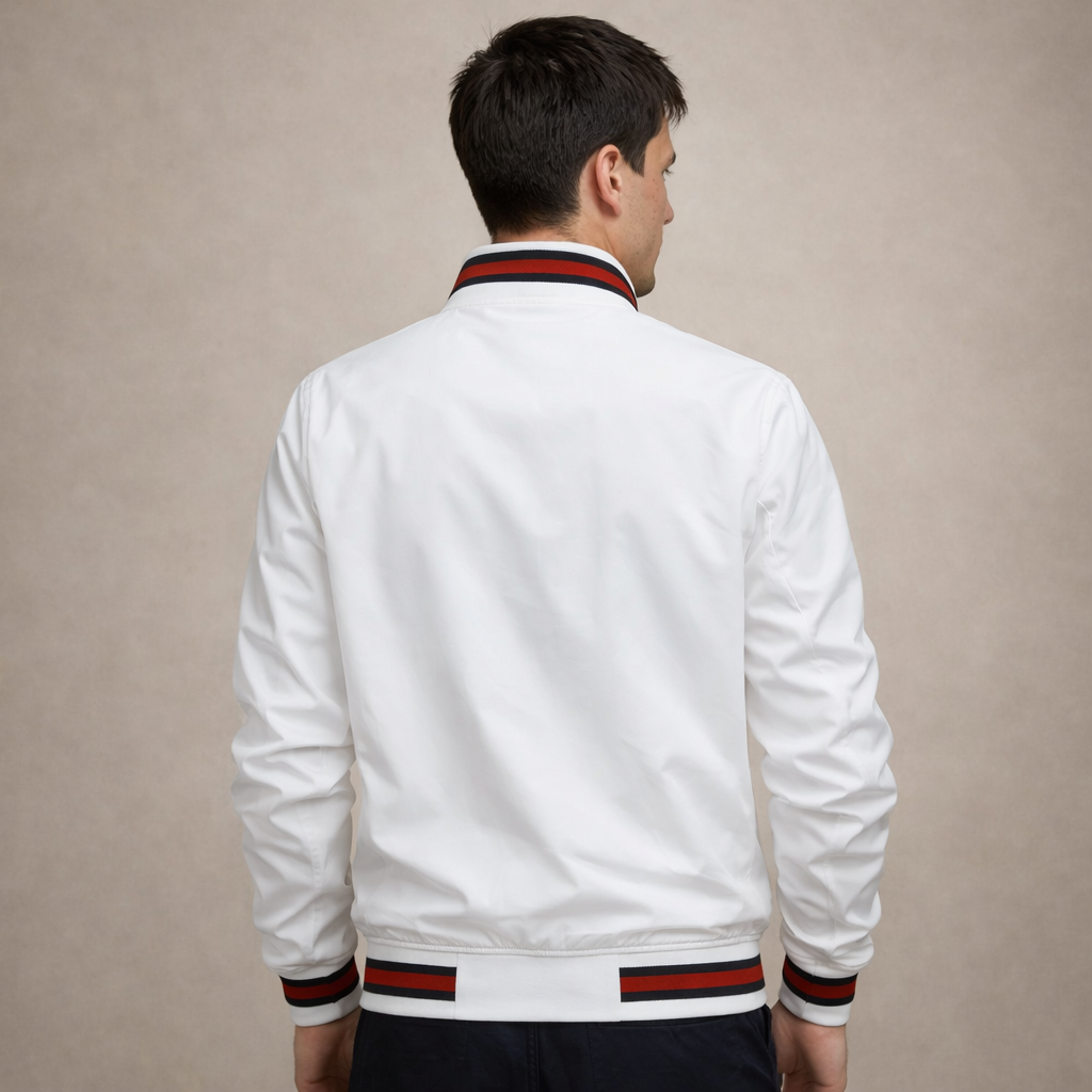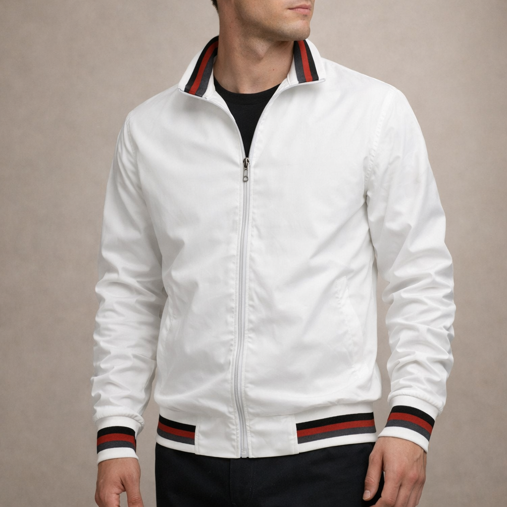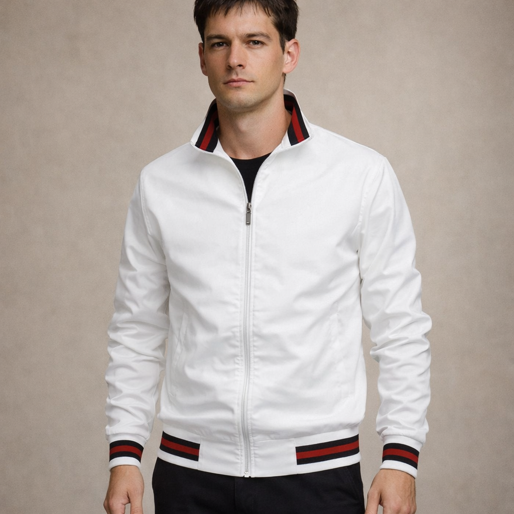 Fresh, sporty and effortlessly versatile, this Men’s White Zip-Up Jacket brings a clean finish to everyday dressing. The crisp white tone is elevated by contrast striped trims, making it ideal for casual weekends, travel or relaxed smart-casual styling.
