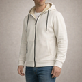 Details: Full front zip fastening and practical front pockets, complemented by contrasting drawstrings for subtle definition