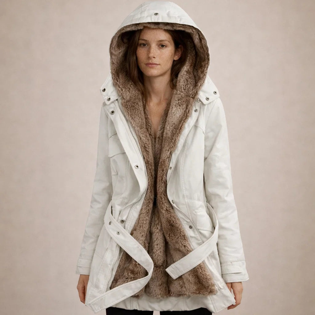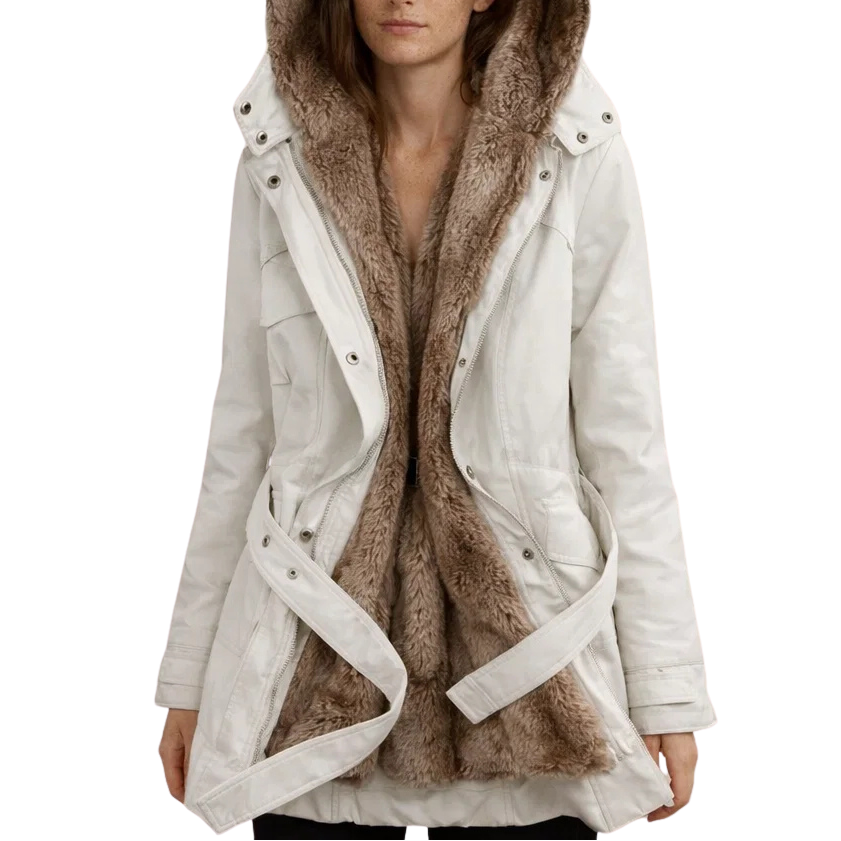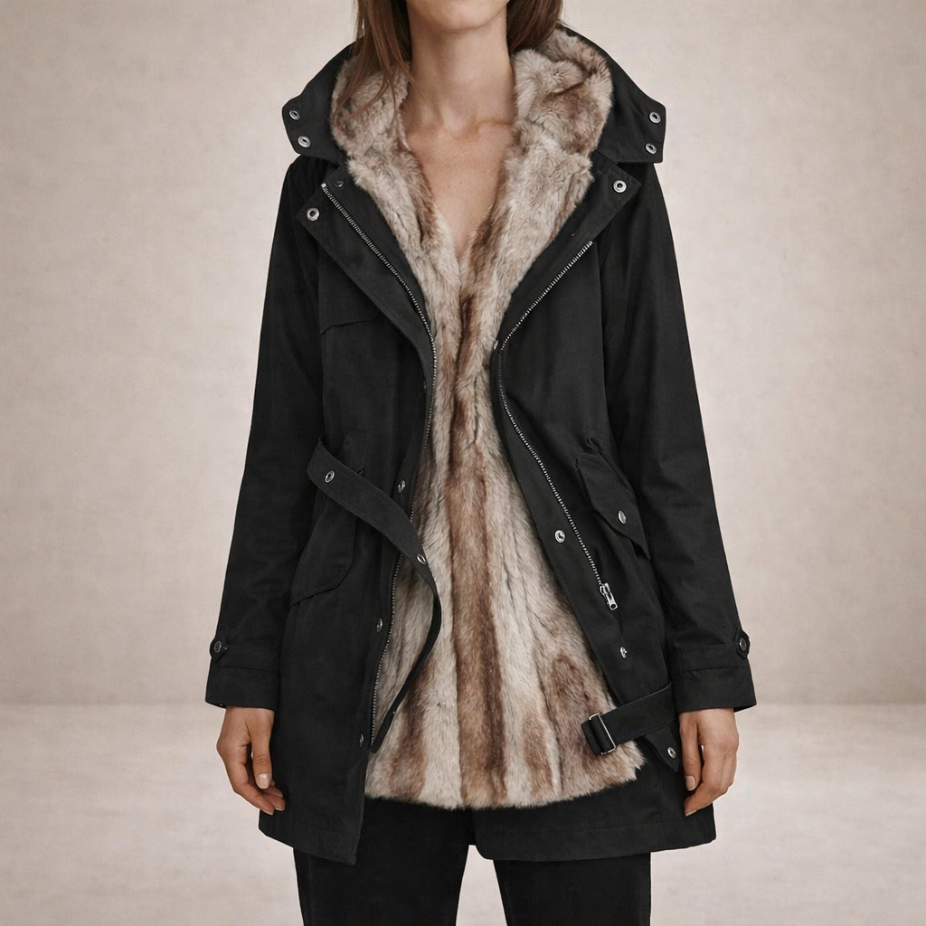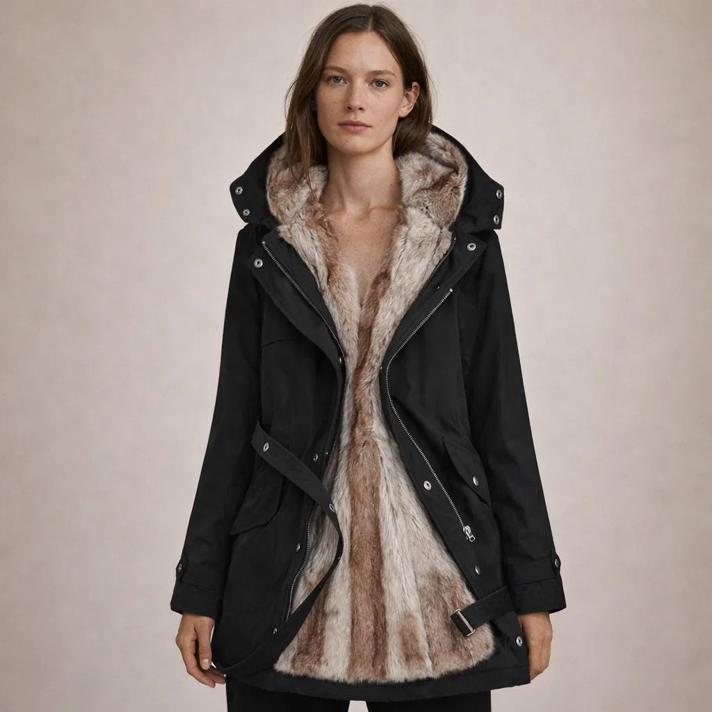 Women’s Belted Parka with Plush Fur Lining and Storm Hood
