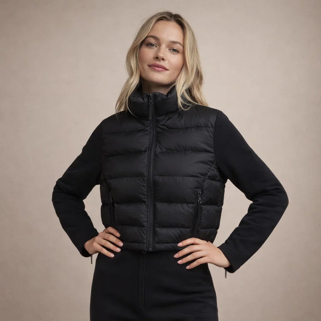 Design: Cropped silhouette with horizontal quilted padding and a clean, minimalist finish
