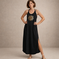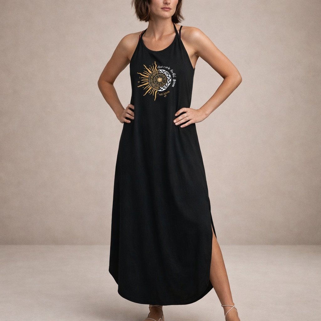 Key features of this Women’s Black Halter Maxi Dress with Sun Graphic