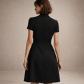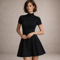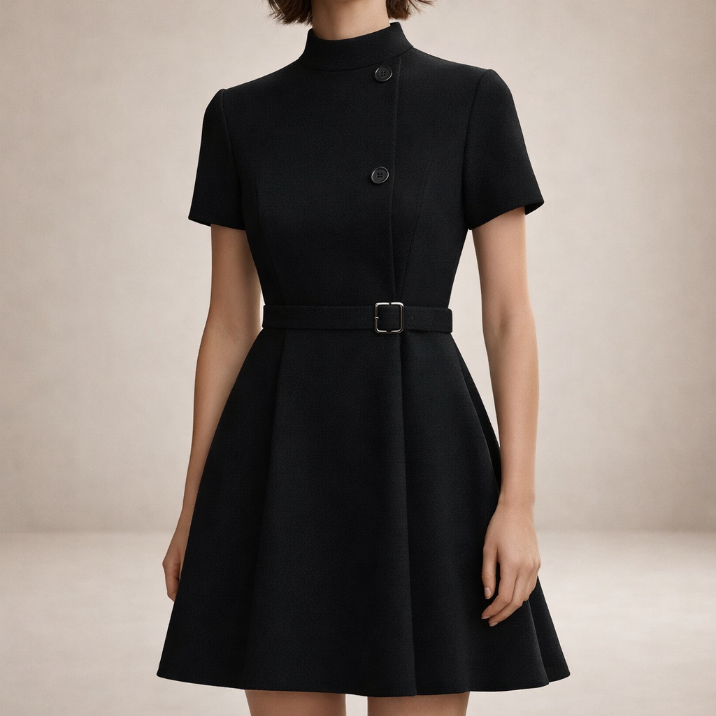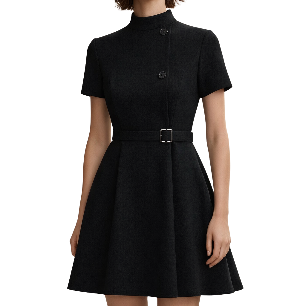 This sleek black dress features a modern high neckline and a clean, structured silhouette that delivers timeless elegance with a contemporary edge. Designed with short sleeves and a subtle asymmetric button detail at the shoulder, the dress is finished with a slim waist belt that defines the figure and enhances its tailored shape. The softly flared skirt adds movement while maintaining a refined, minimalist look.