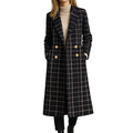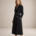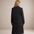This women’s long coat features a classic black base with an elegant windowpane check pattern, creating a refined and timeless look. Designed with a structured silhouette and accented by gold-tone buttons, the coat blends tailored sophistication with modern styling, making it suitable for both professional and polished everyday outfits.