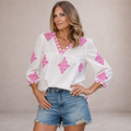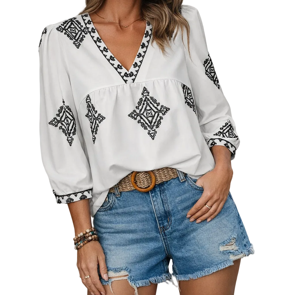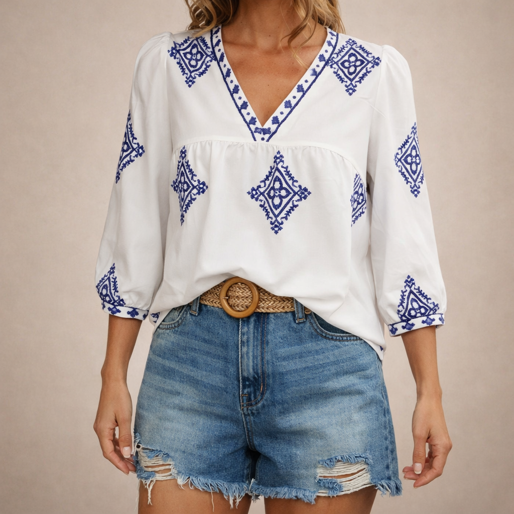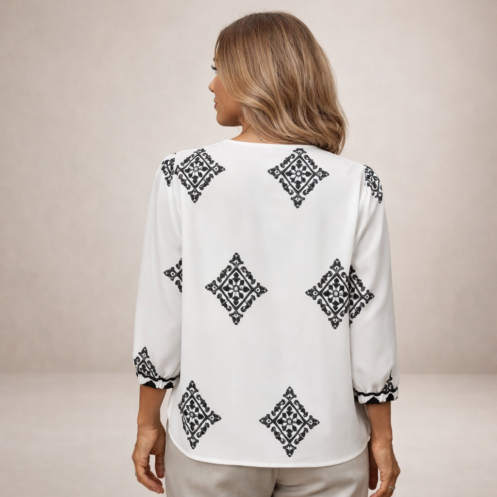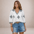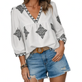 Design: Soft, flowing silhouette enhanced by statement retro-inspired prints and a flattering V-neckline