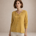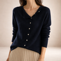 Design: Minimal button-through cardigan featuring a softly draped neckline with distinctive asymmetric collar detail