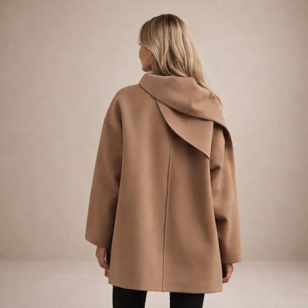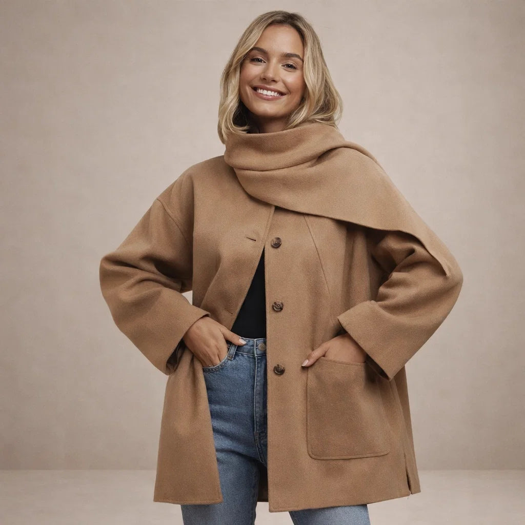 Design: Relaxed mid-length silhouette in a classic camel shade, complemented by a coordinating oversized scarf