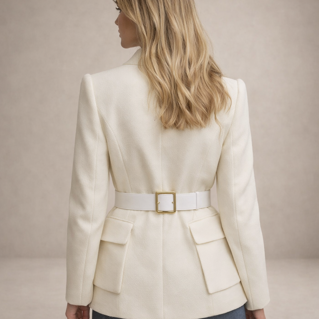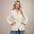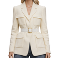This women’s cream tailored blazer blends classic structure with a modern, feminine silhouette. Designed with a defined waist and matching belt, it creates a polished look that works effortlessly for both professional and elevated casual styling. The soft, textured fabric and utility-inspired pockets add subtle character while maintaining a refined finish.