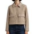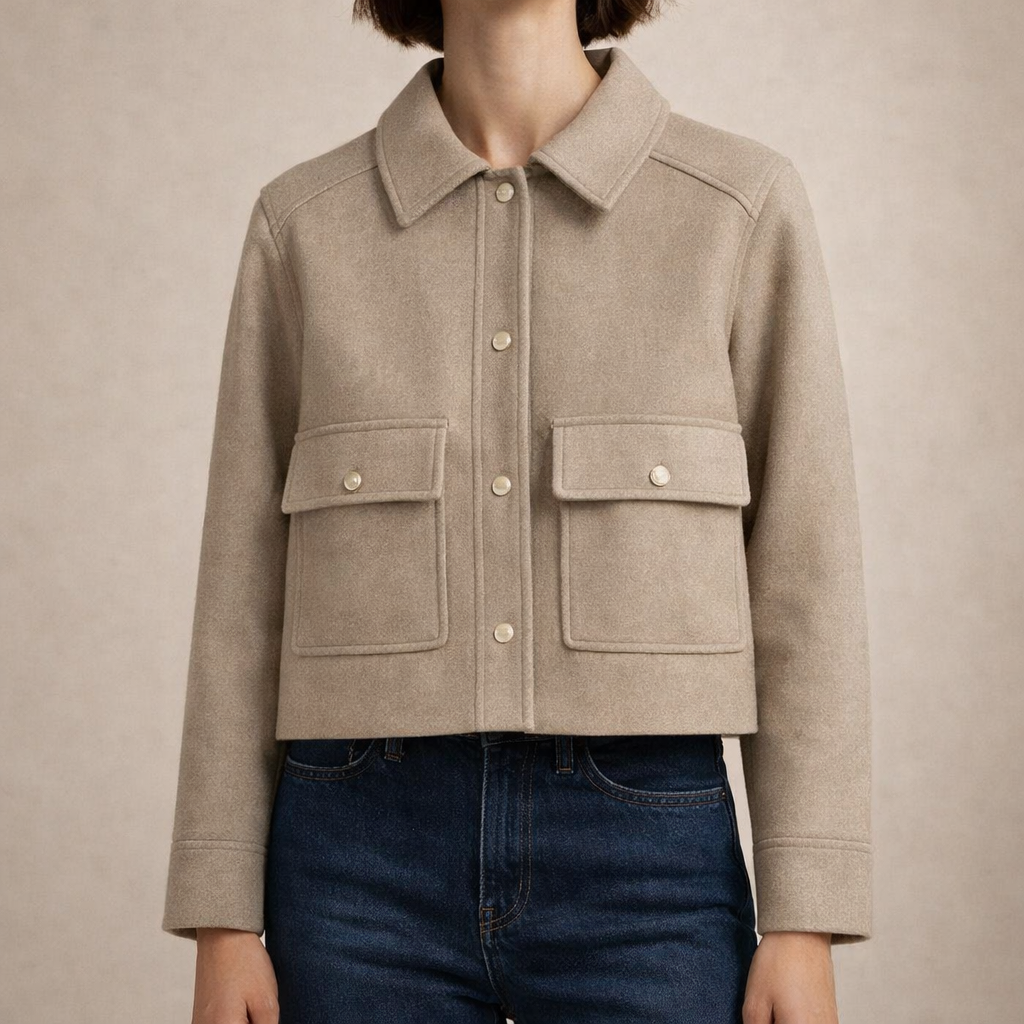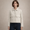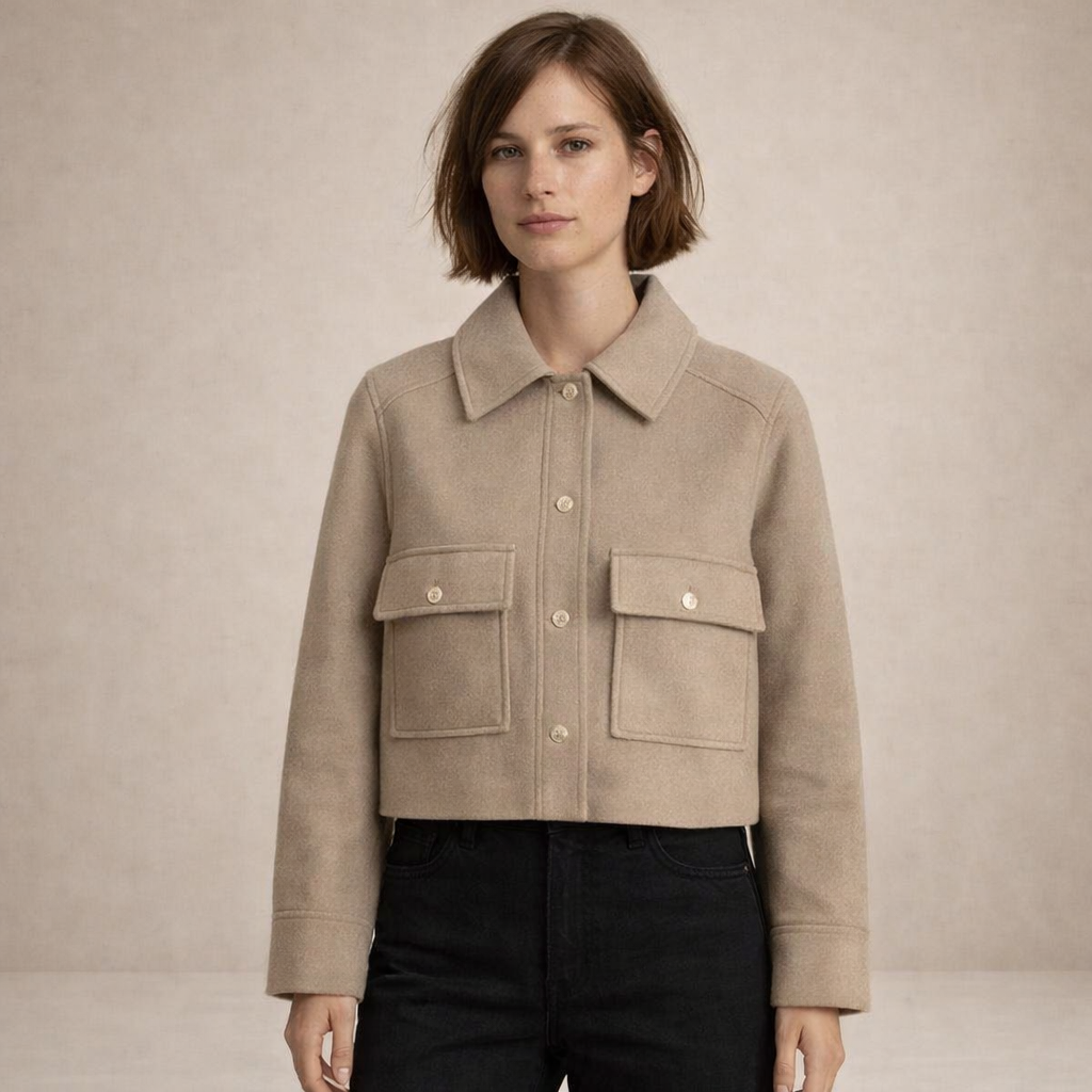 Design: Cropped silhouette with a classic collar and symmetrical flap chest pockets for a balanced, tailored finish