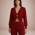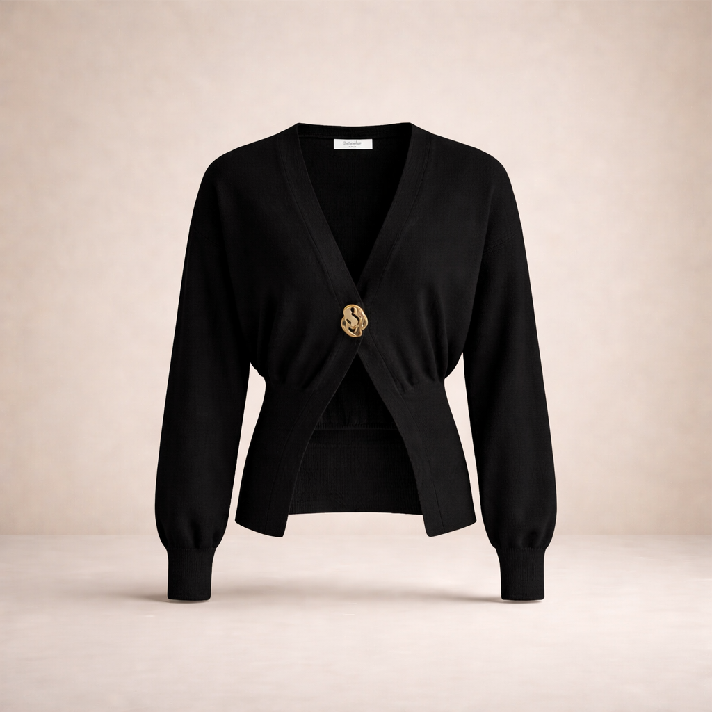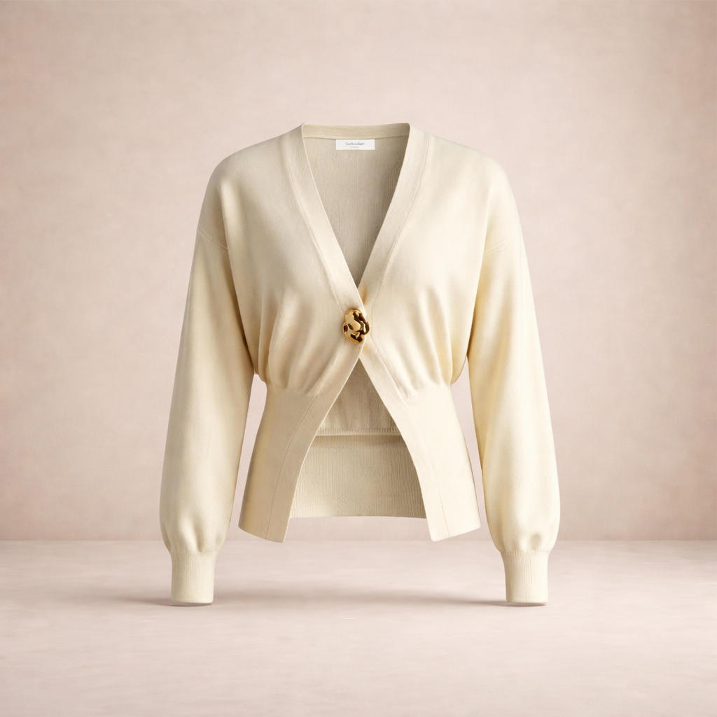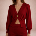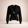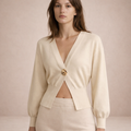 Design: A deep V-neckline with a softly structured shape, centred by a distinctive clasp detail that adds modern elegance.