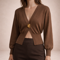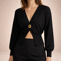 Women’s Elegant V-Neck Wrap-Style Top with Gold Accent Button and Flowy Sleeves