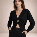 This women’s V-neck knitted top presents a refined, contemporary silhouette with a subtle statement detail. Elegant yet easy to wear, it’s ideal for evening outings, smart-casual occasions or styled effortlessly for a modern day look.