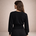 Details: Refined long sleeves with gentle volume at the cuffs and a polished centre fastening for subtle visual interest.