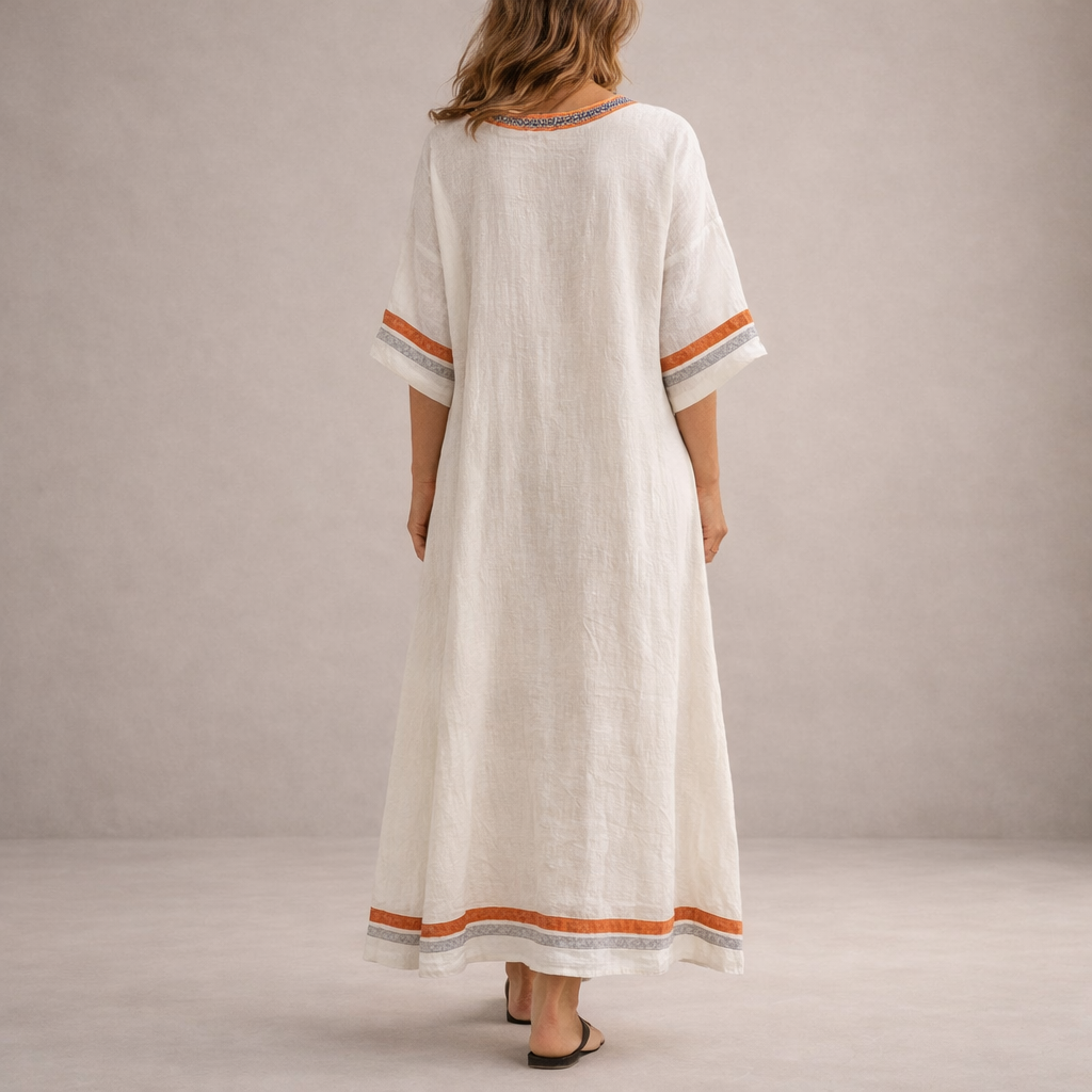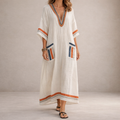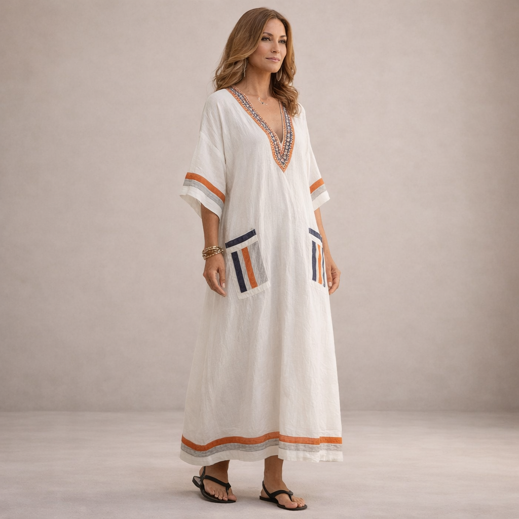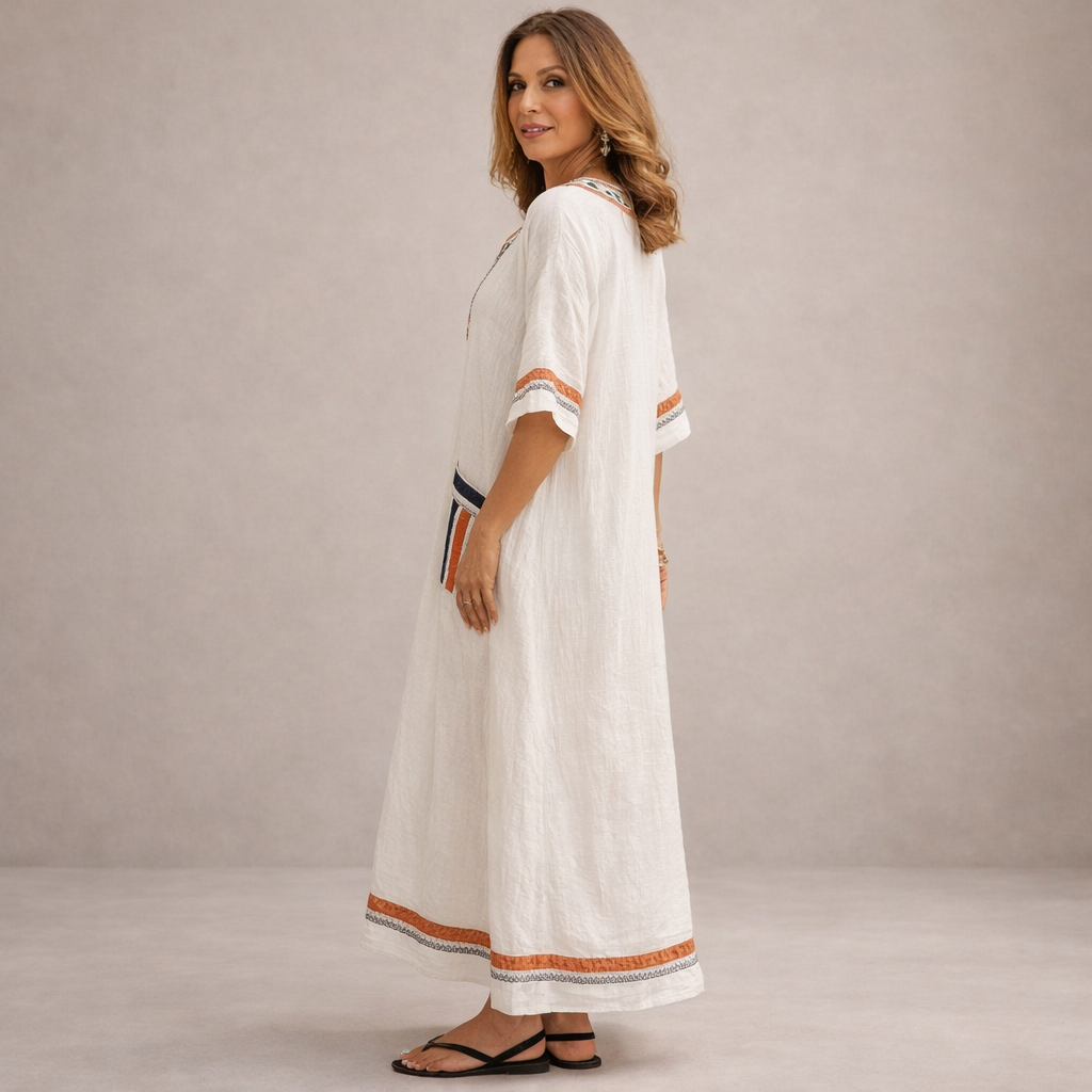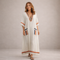 This women’s embroidered V-neck maxi dress offers a relaxed yet refined silhouette, ideal for warm days, holidays and effortless everyday wear. With its flowing shape and decorative detailing, it combines comfort with understated elegance for a naturally stylish look.