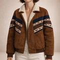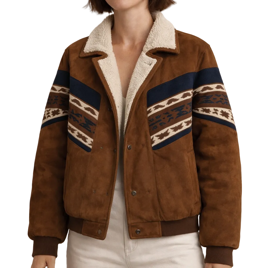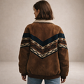 Women’s Faux Suede Jacket with Shearling Collar and Aztec Detail Brown