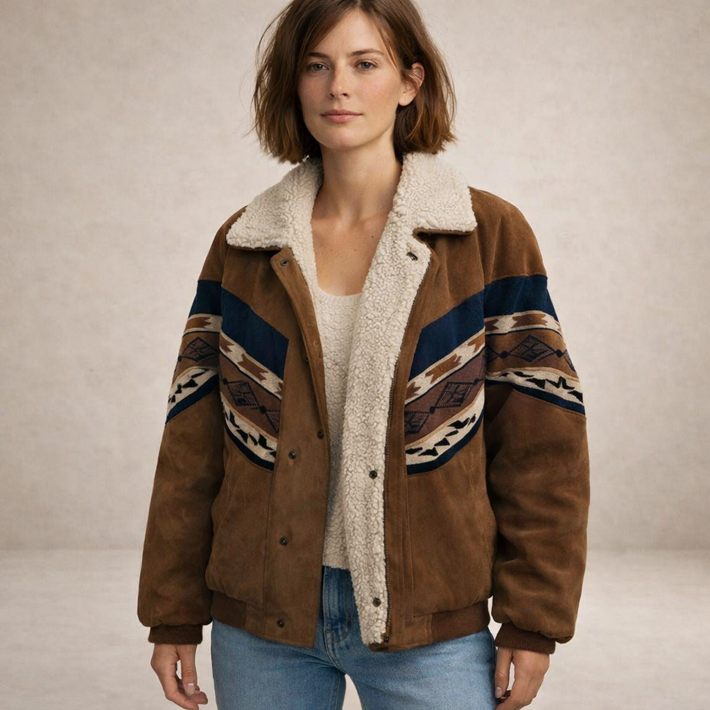 Bold, cosy and effortlessly distinctive, this Women’s Faux Suede Sherpa-Lined Boho Jacket brings warmth and character to your cold-weather wardrobe. The rich earthy tone paired with striking ethnic-inspired panels creates a statement piece that balances comfort with standout style.