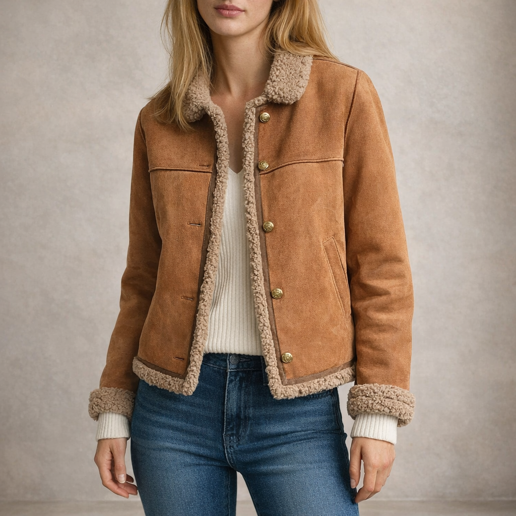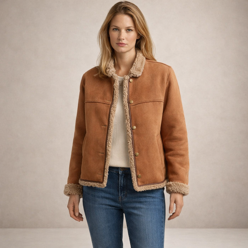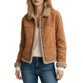 This timeless jacket is crafted from soft faux suede and finished with a cosy shearling-style lining, offering both warmth and understated style. The classic button-front design and neat collar give it a refined, everyday look, while the plush trim adds texture and comfort. Perfect for casual outings, this jacket pairs effortlessly with knitwear and denim for a relaxed yet polished outfit.