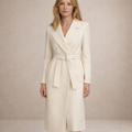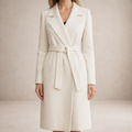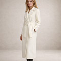 This women’s ivory wrap coat features a clean, elegant silhouette designed with a soft wool-blend fabric and a flattering belted waist. The minimalist wrap-front construction and tailored lines create a timeless outerwear piece that offers both warmth and refined style, ideal for everyday wear or more formal occasions.