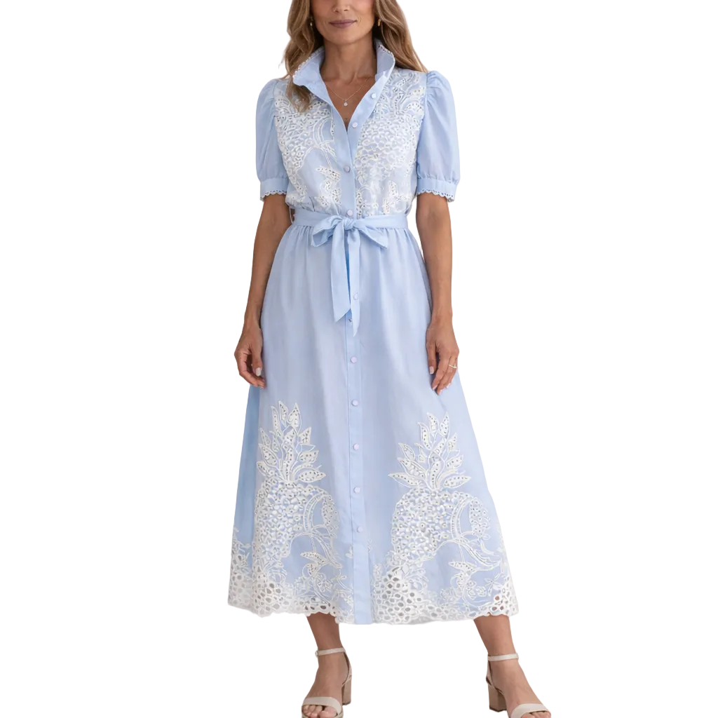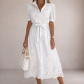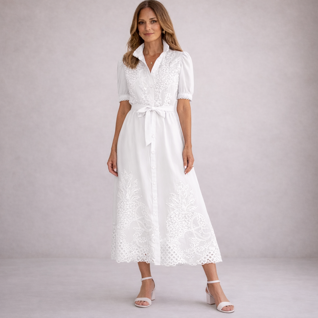 Design: Classic shirt-dress silhouette enhanced with intricate lace panels for a graceful, timeless finish