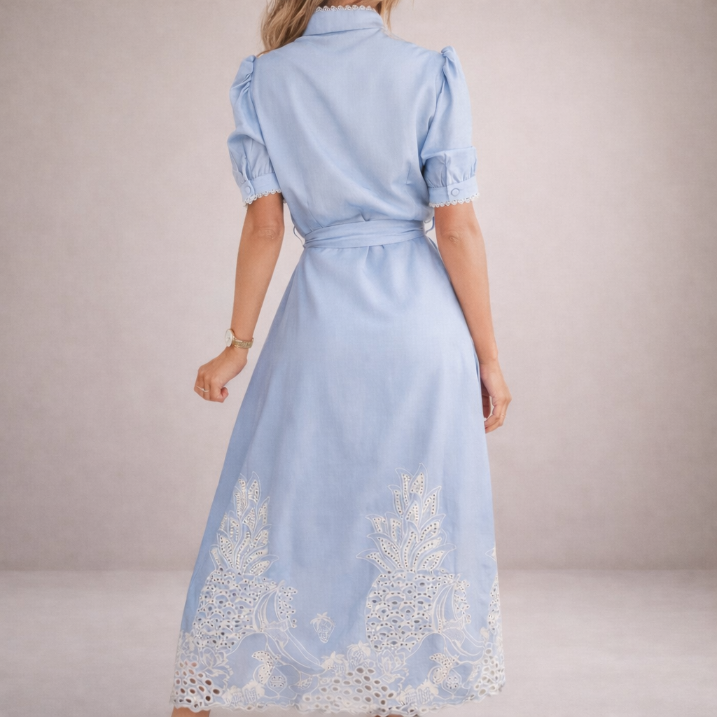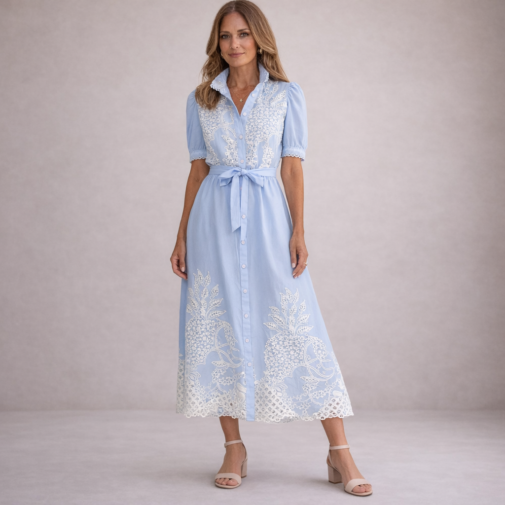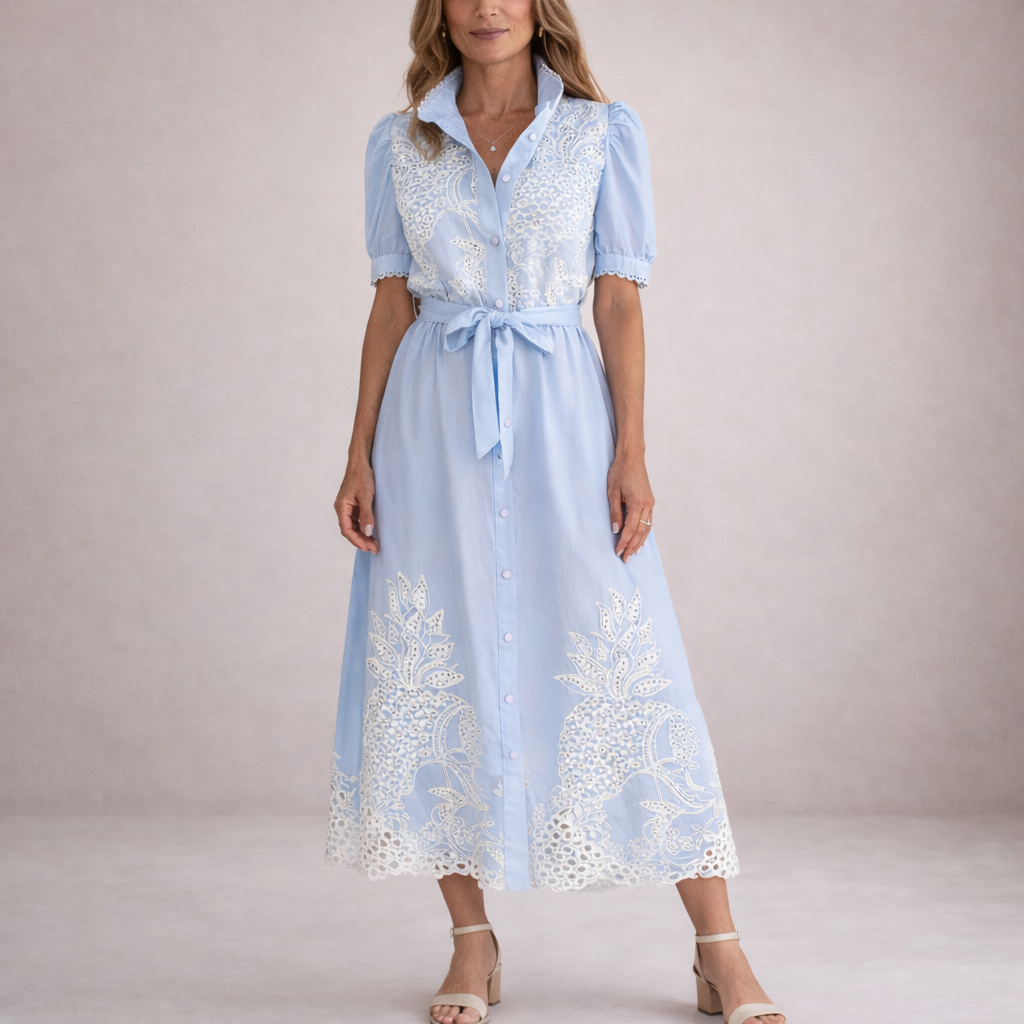 This women’s maxi shirt dress combines soft structure with delicate detailing for a refined, feminine look. Designed for daytime occasions, summer gatherings or relaxed events, it offers timeless elegance with the added versatility of multiple colour options.