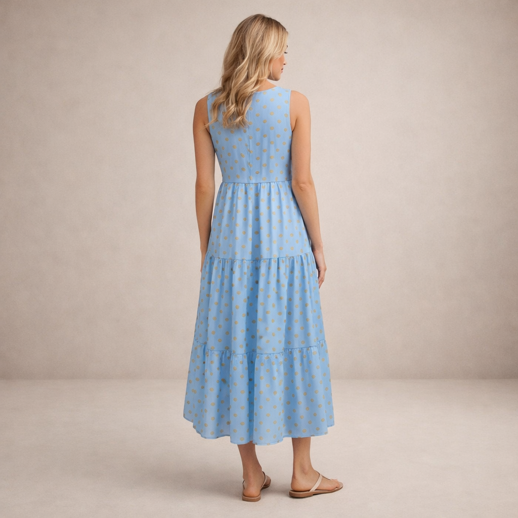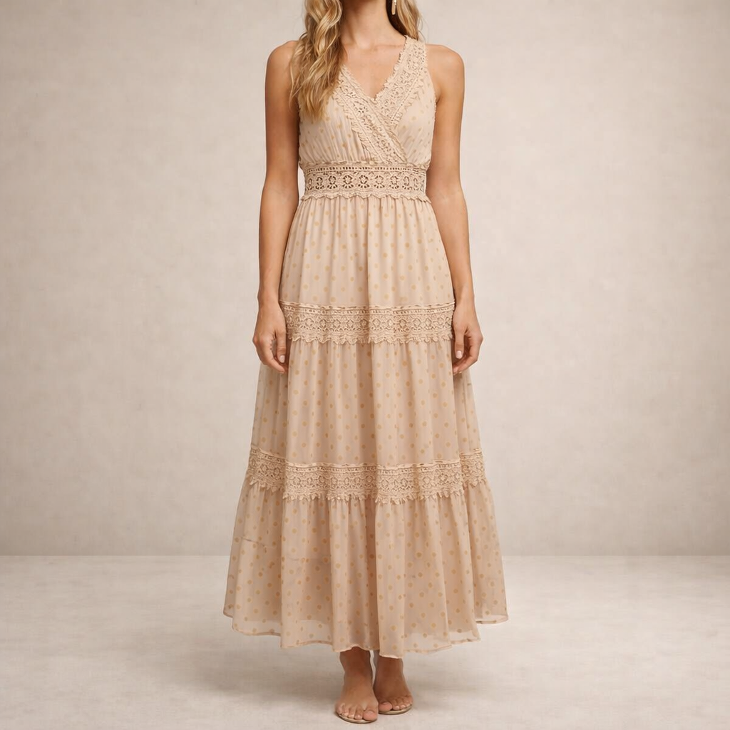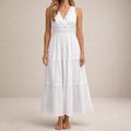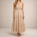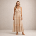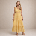 Design: Sleeveless wrap-style bodice with a flattering V neckline and tiered maxi skirt for soft movement
