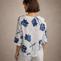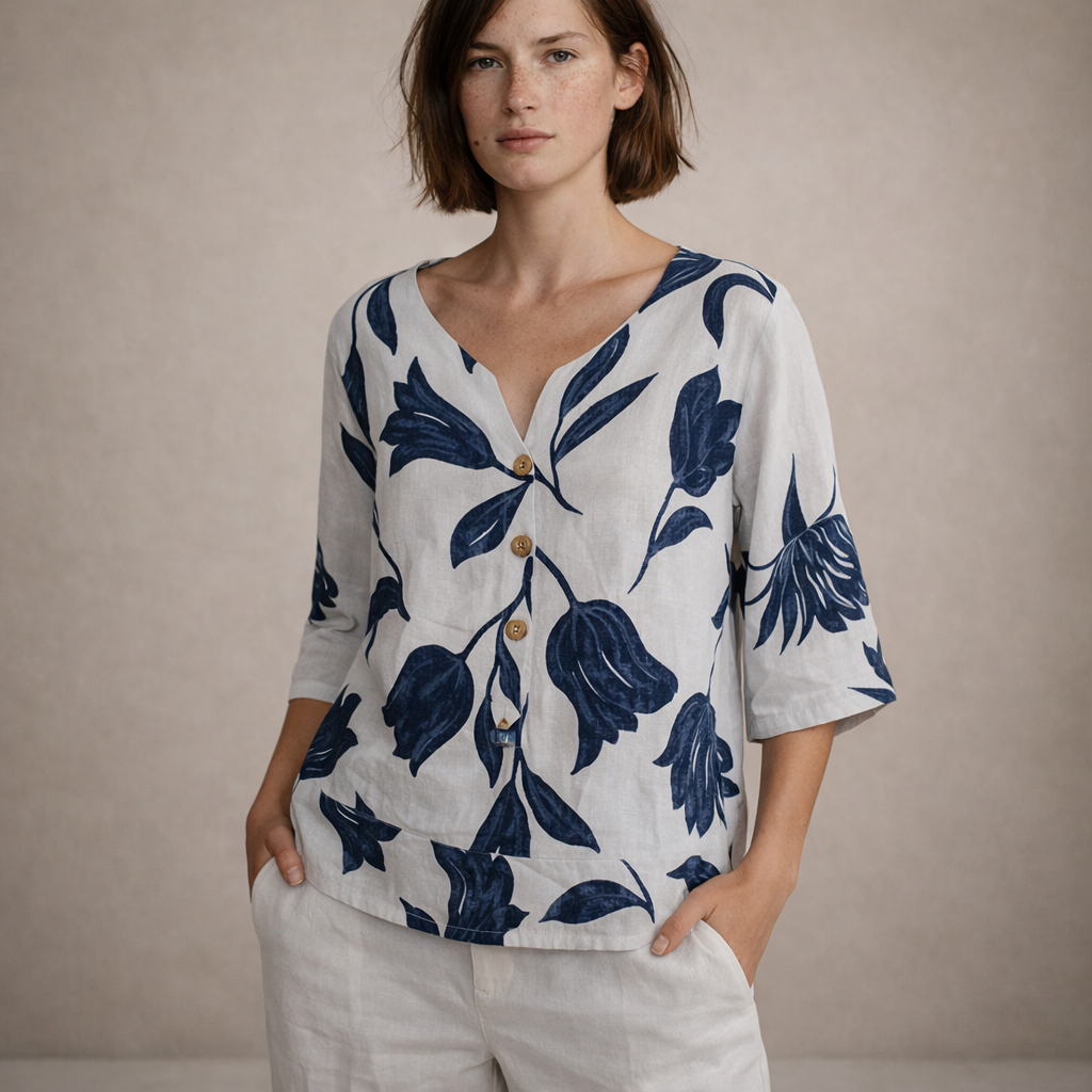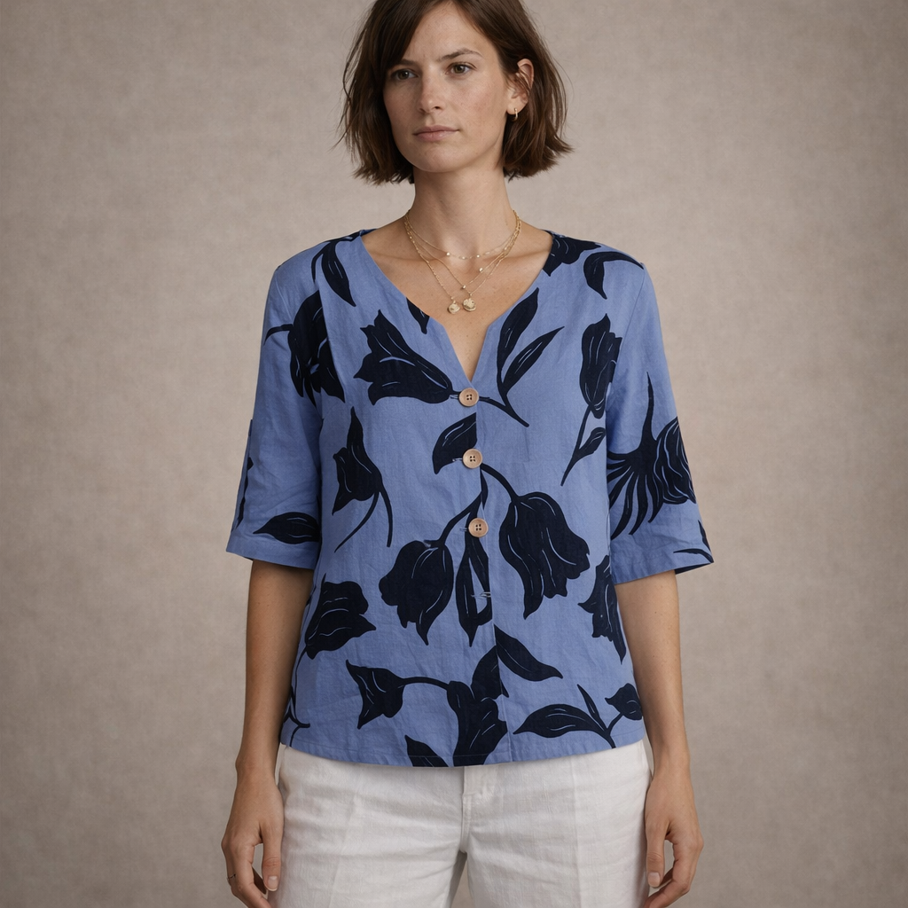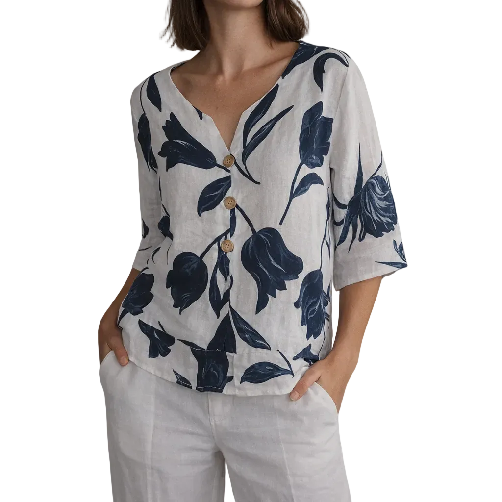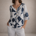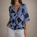Women’s Linen Blouse with V-Neck Floral Print