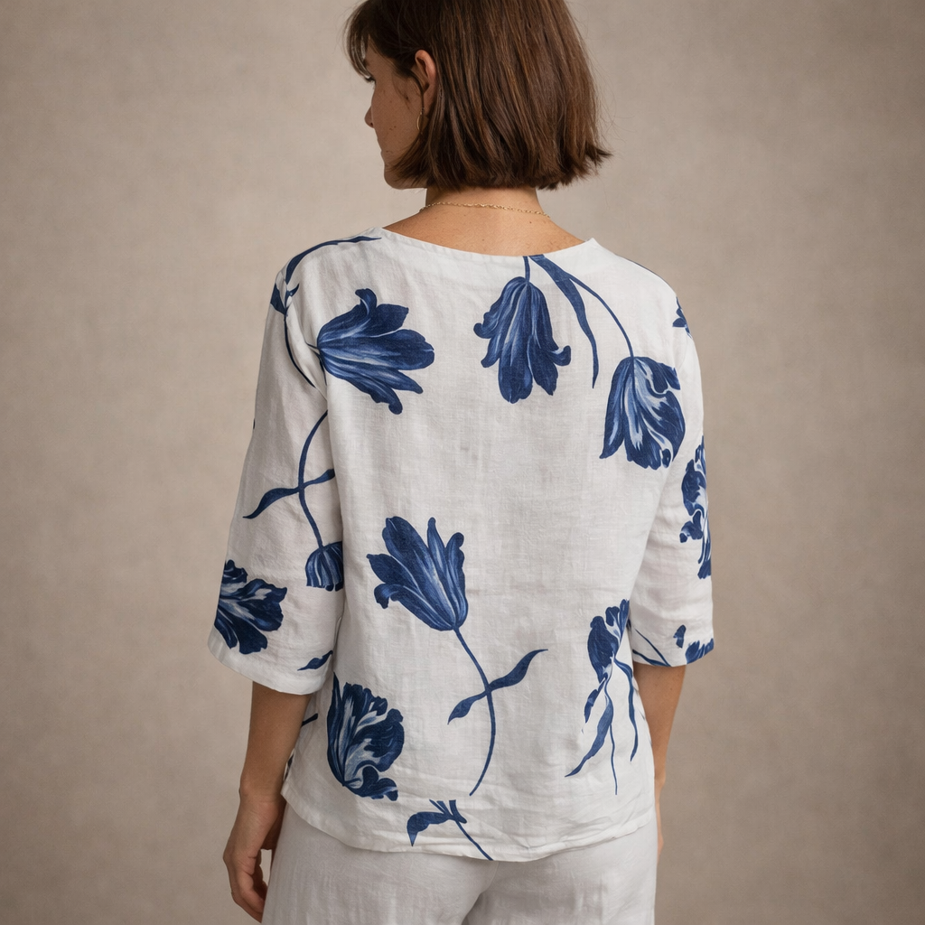 This linen blouse with floral print delivers an effortlessly refined look, perfect for warm-weather styling. With its relaxed silhouette and airy feel, it’s ideal for casual days, holidays or understated daytime occasions.