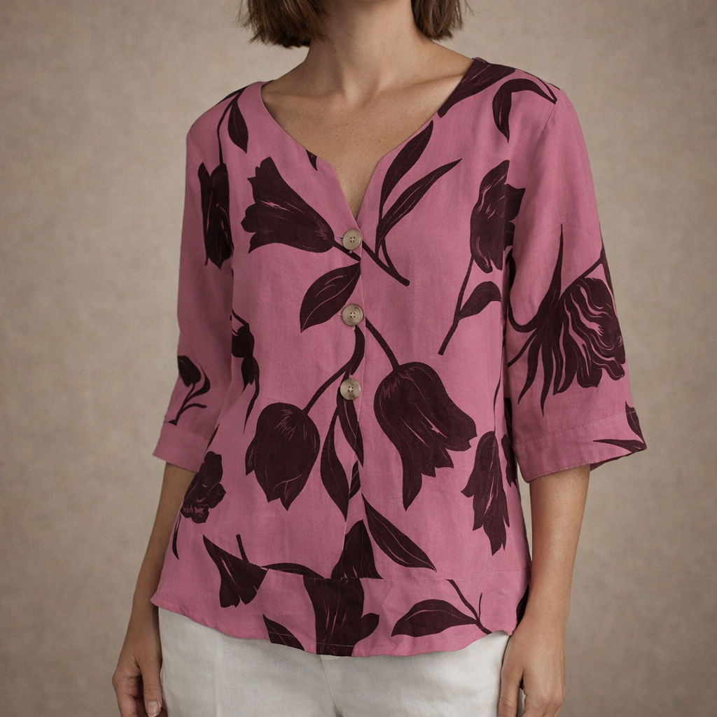 Key features of this Women’s Linen Blouse with V-Neck Floral Print
