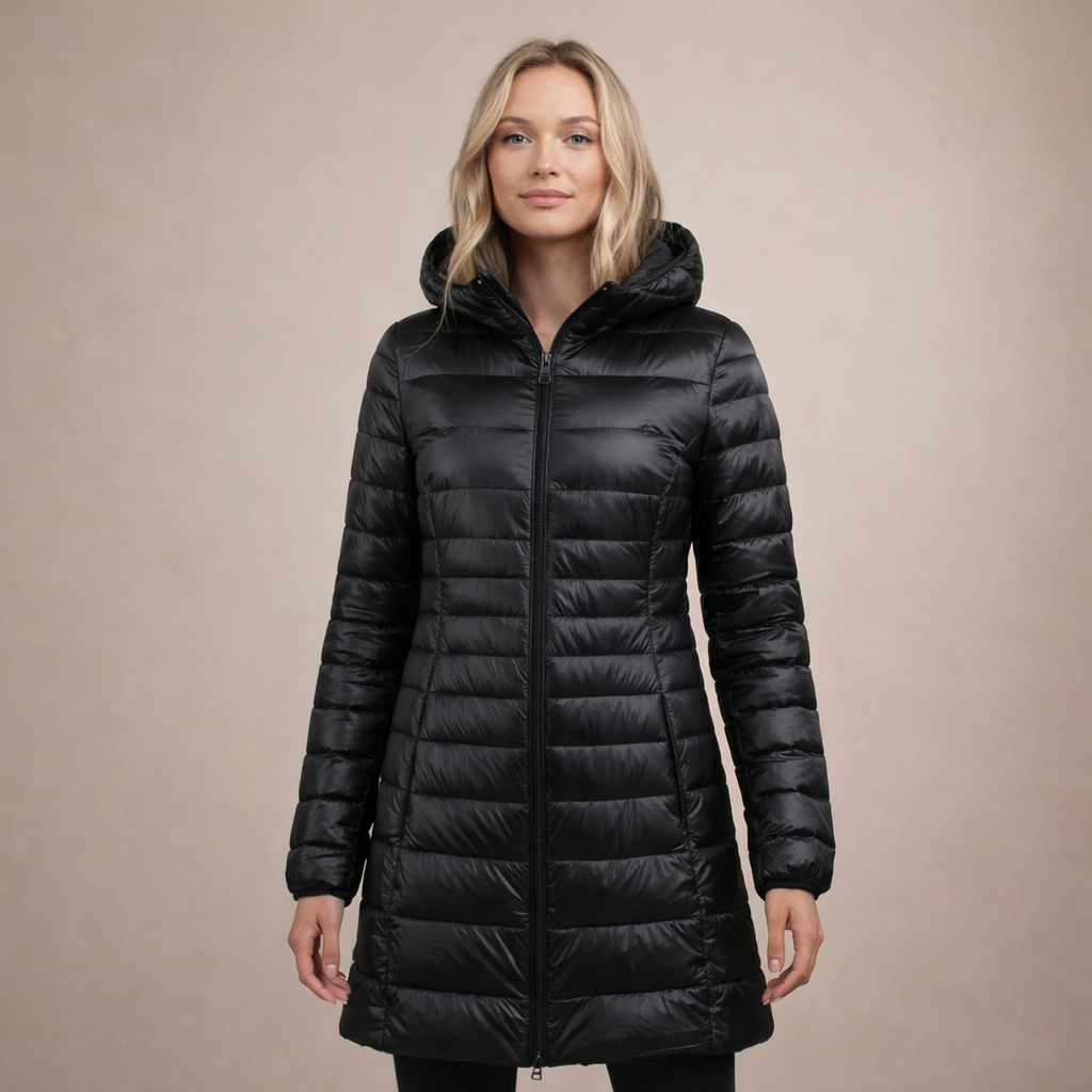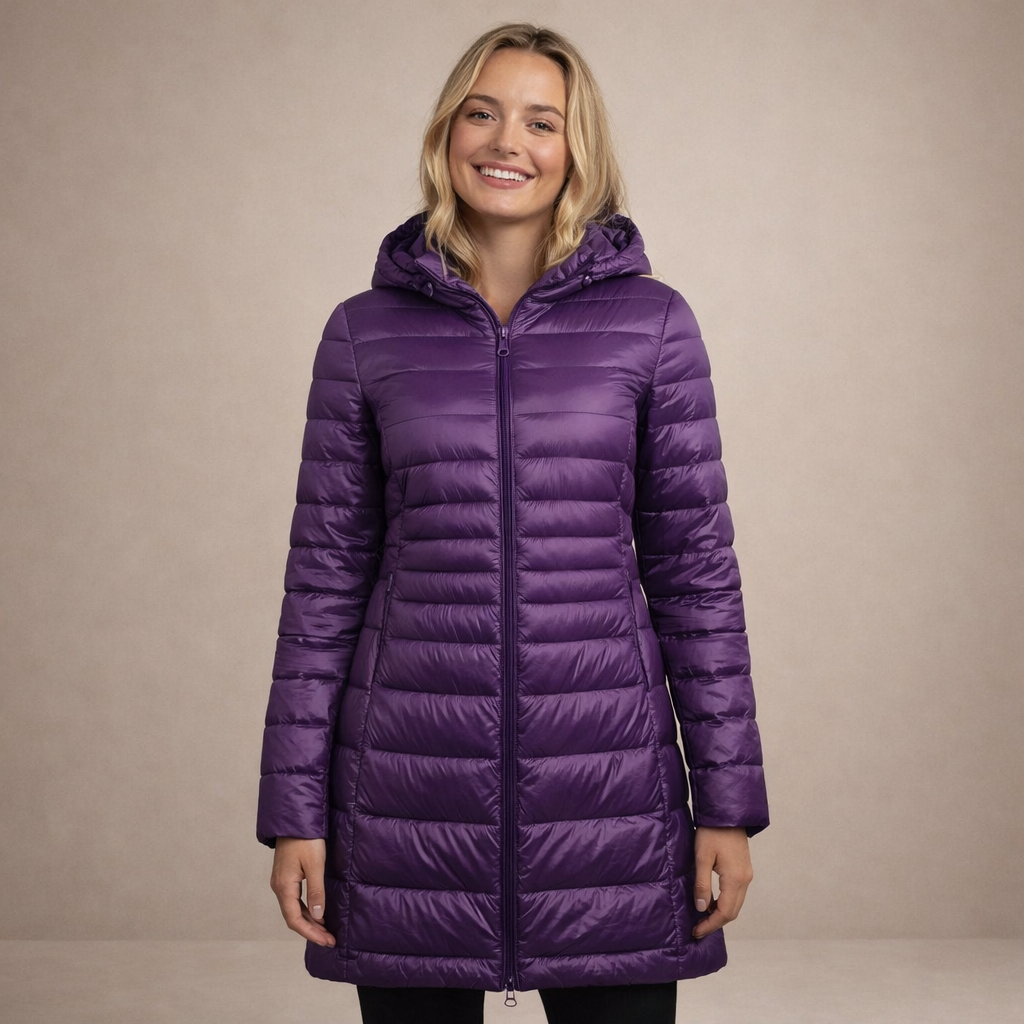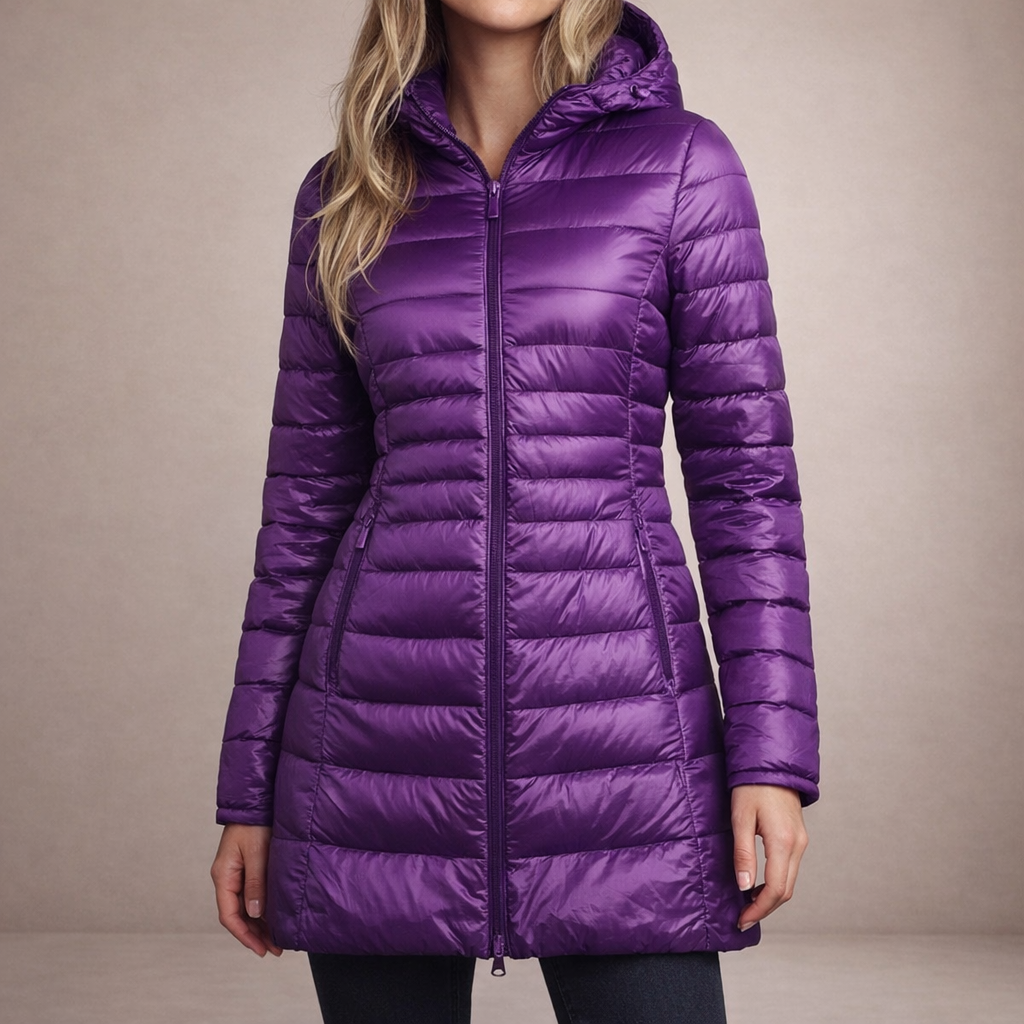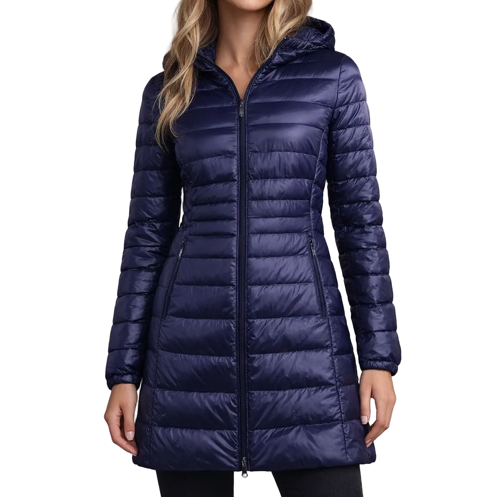 This long women’s puffer jacket offers a sleek, modern look while providing reliable warmth for colder days. Designed with a streamlined silhouette and practical hood, it is ideal for everyday wear, city outings and seasonal layering.