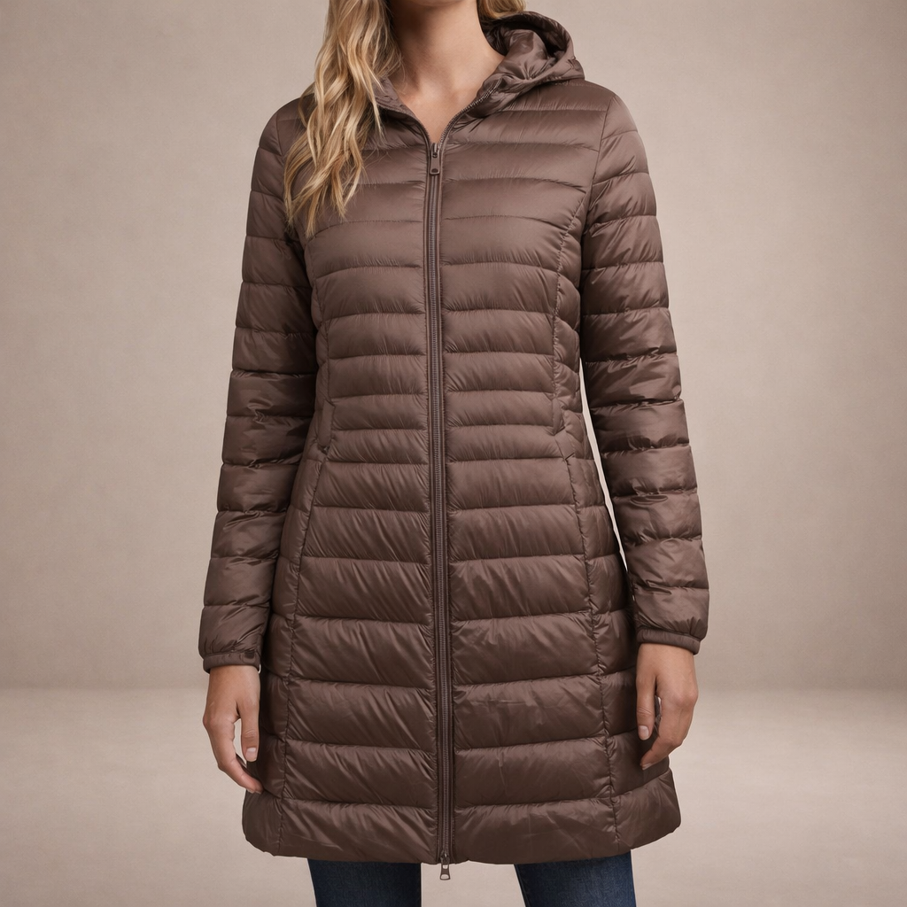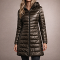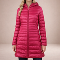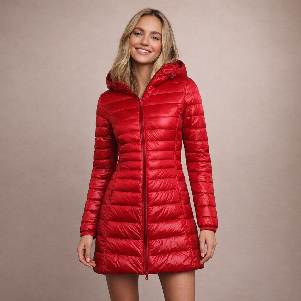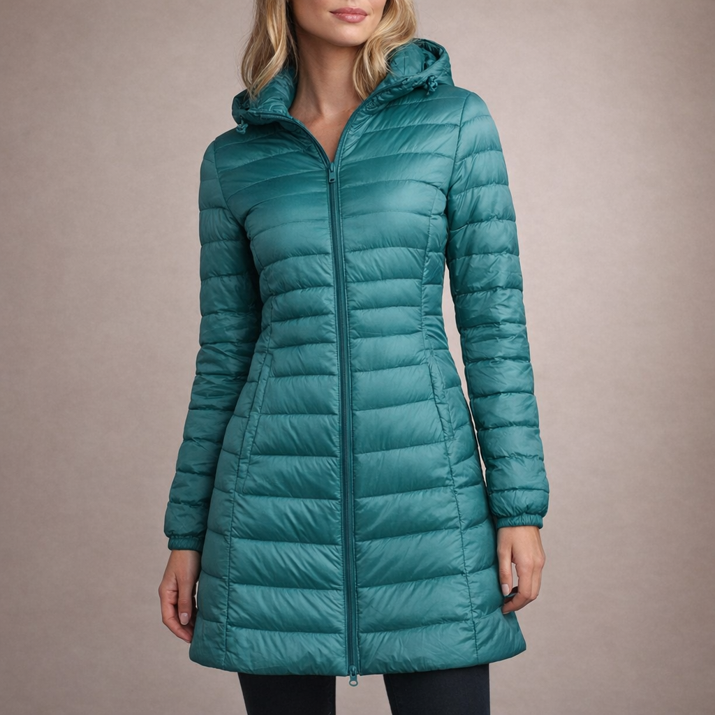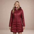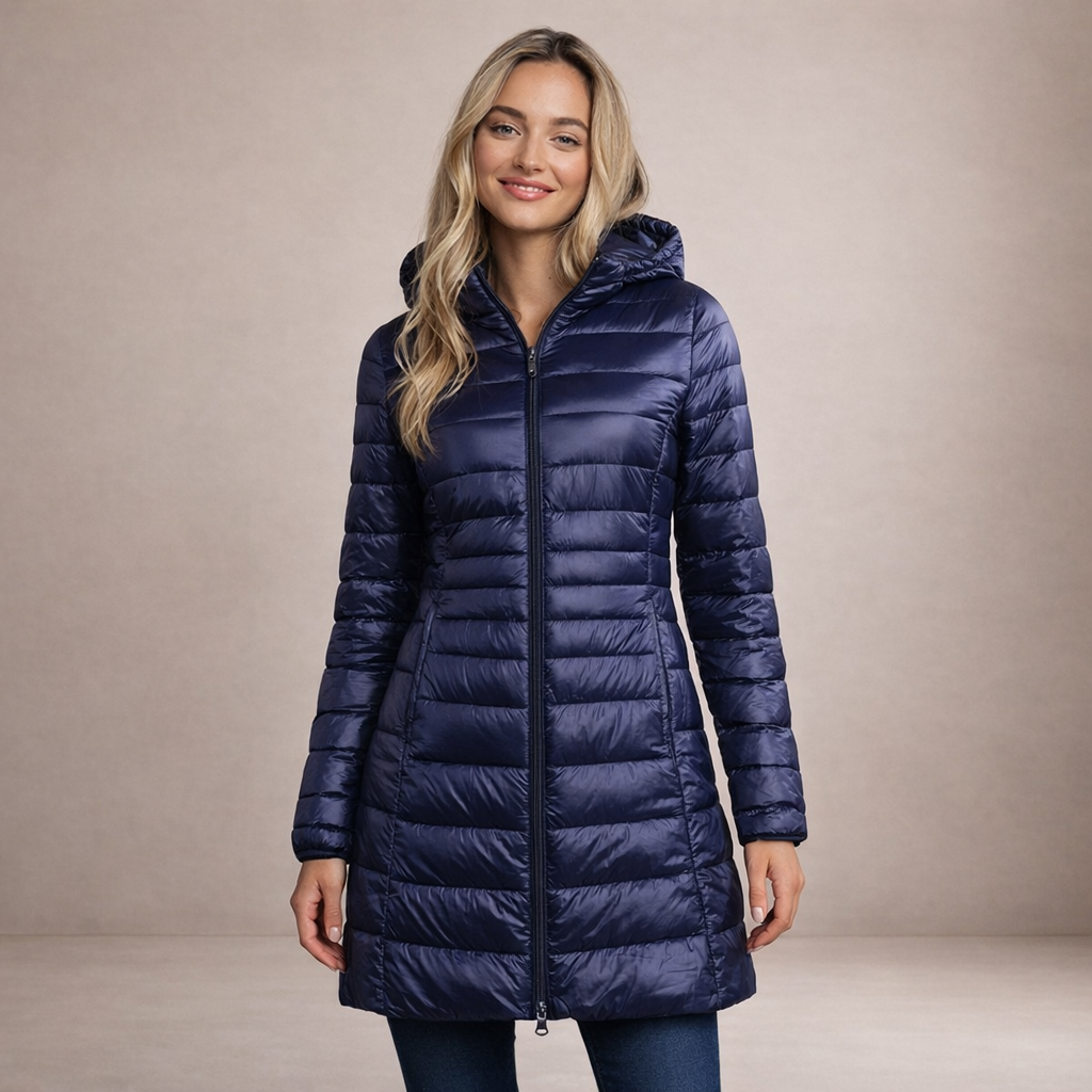 This long women’s puffer jacket offers a sleek, modern look while providing reliable warmth for colder days. Designed with a streamlined silhouette and practical hood, it is ideal for everyday wear, city outings and seasonal layering.