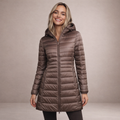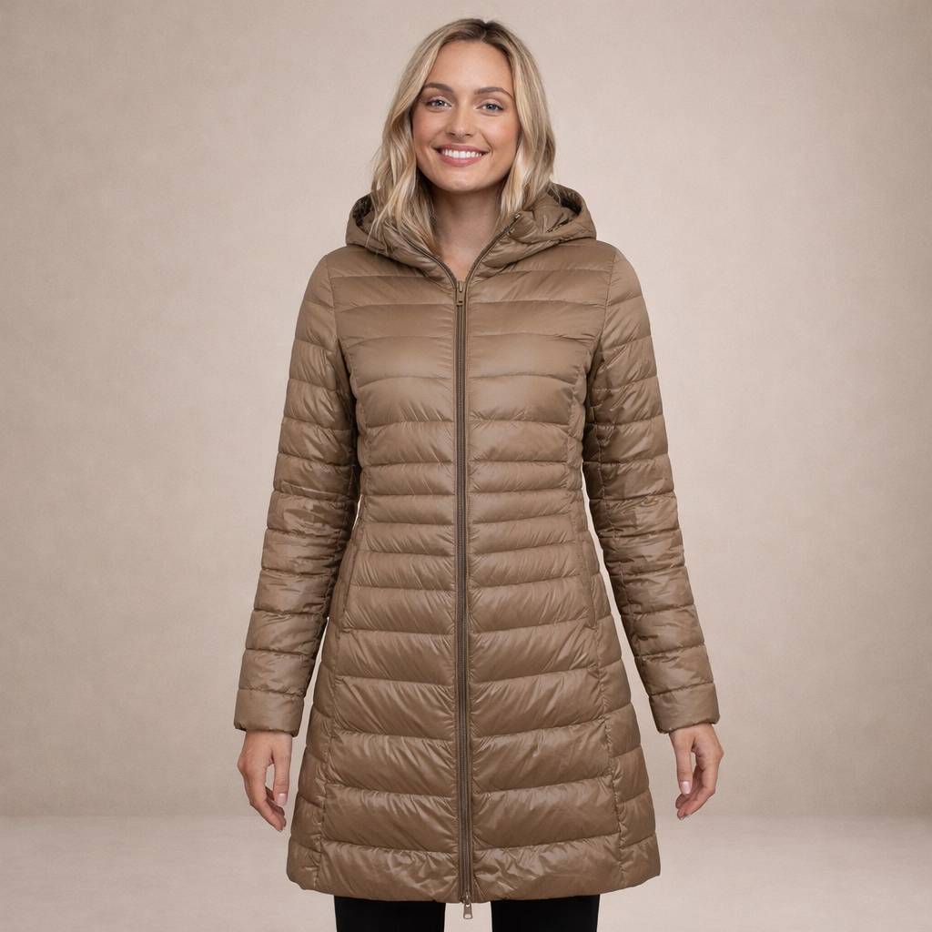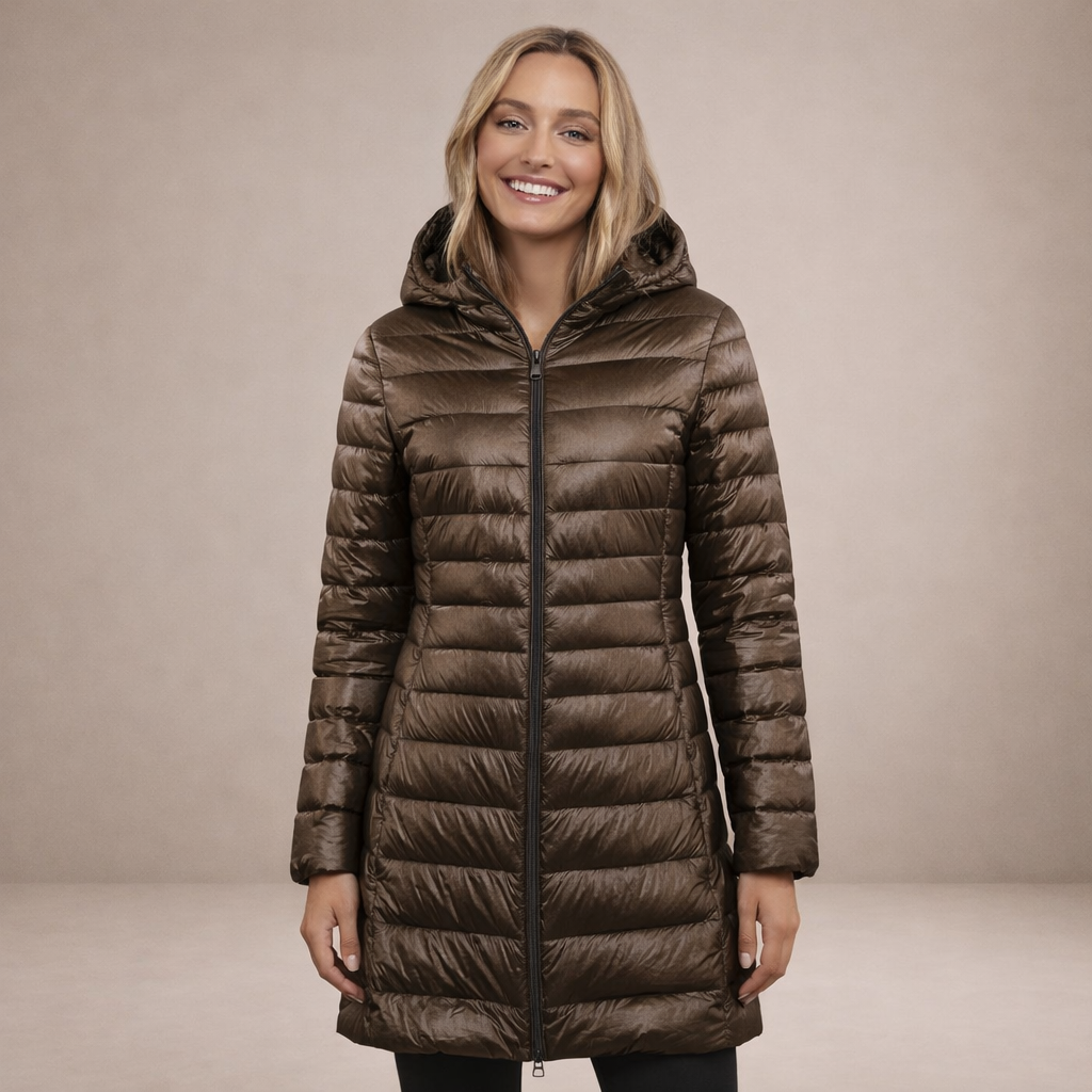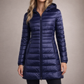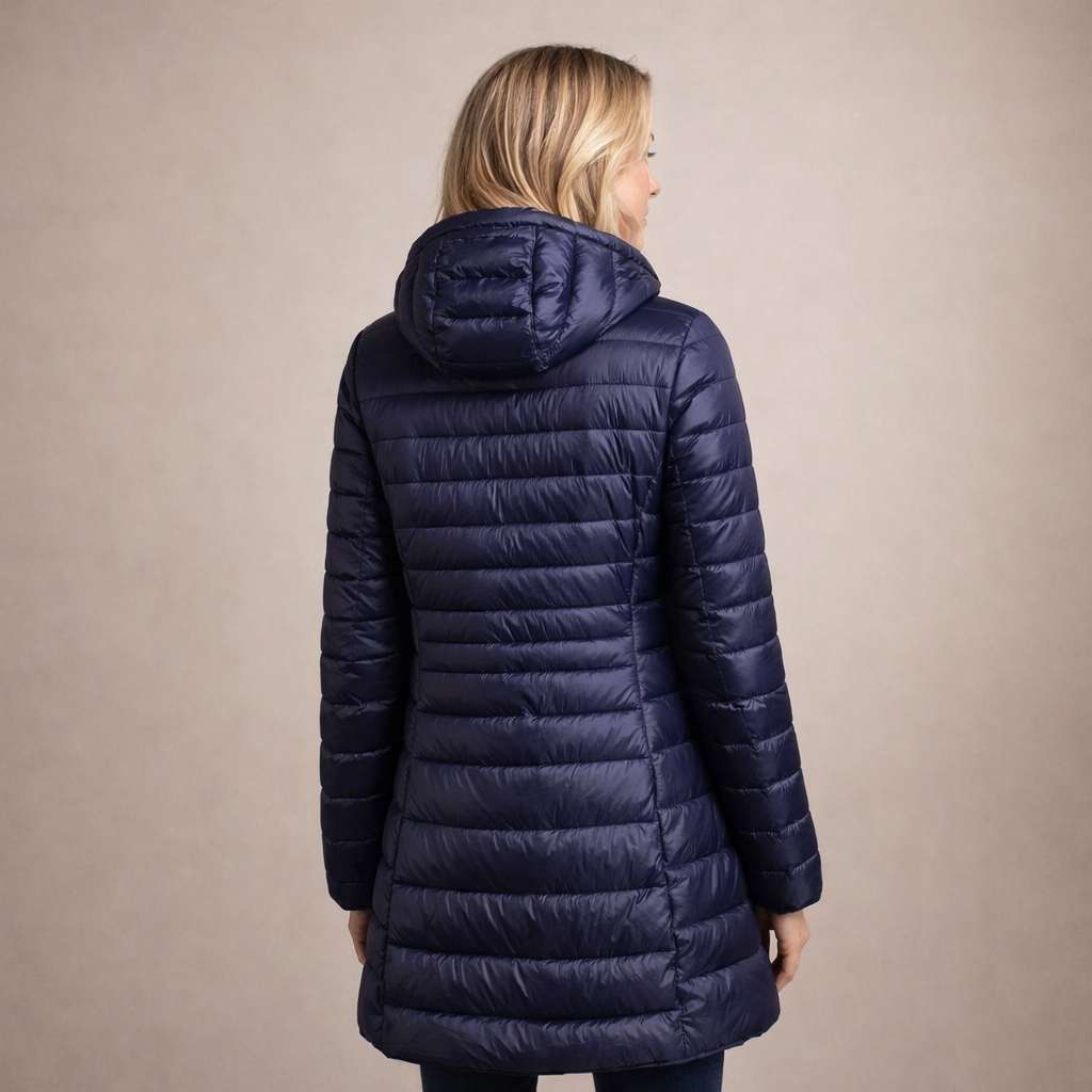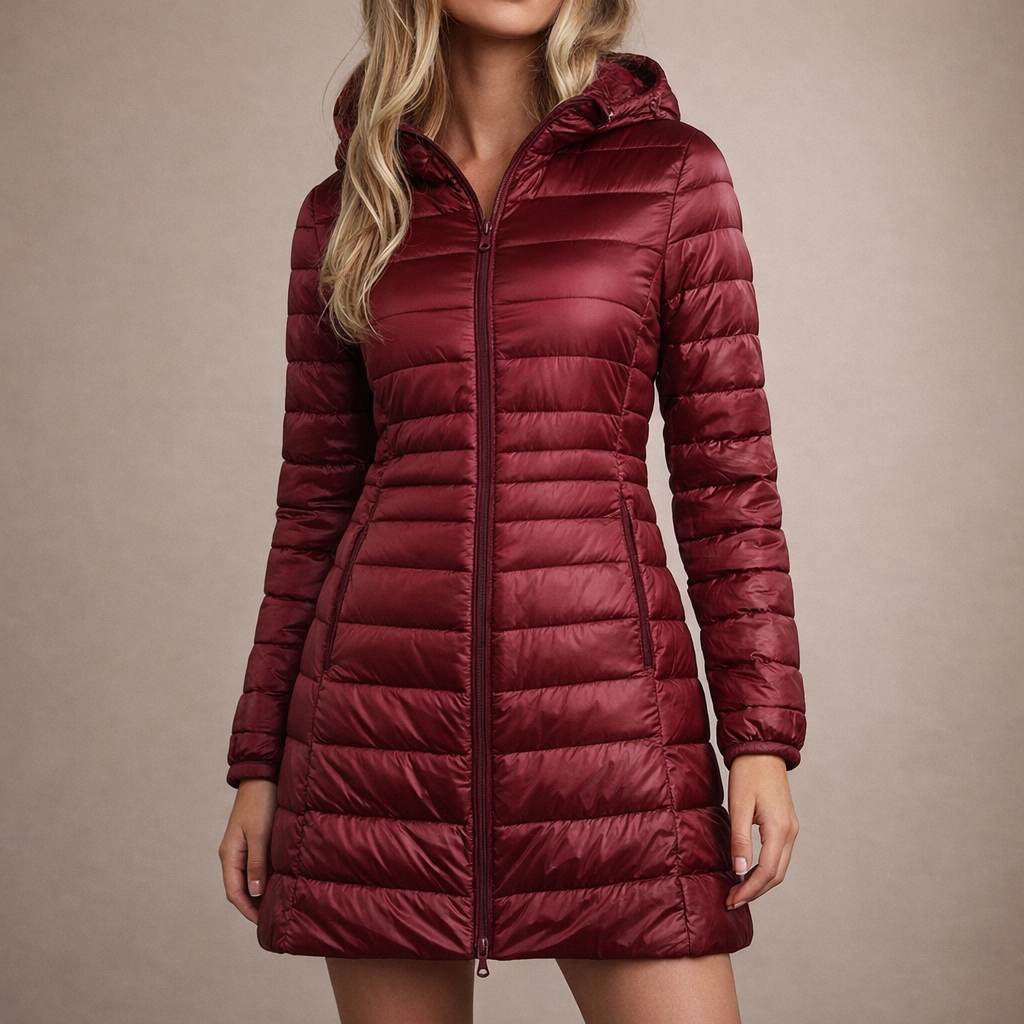 This long women’s puffer jacket offers a sleek, modern look while providing reliable warmth for colder days. Designed with a streamlined silhouette and practical hood, it is ideal for everyday wear, city outings and seasonal layering.
