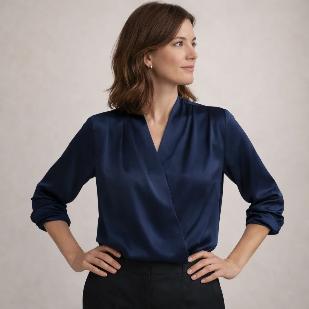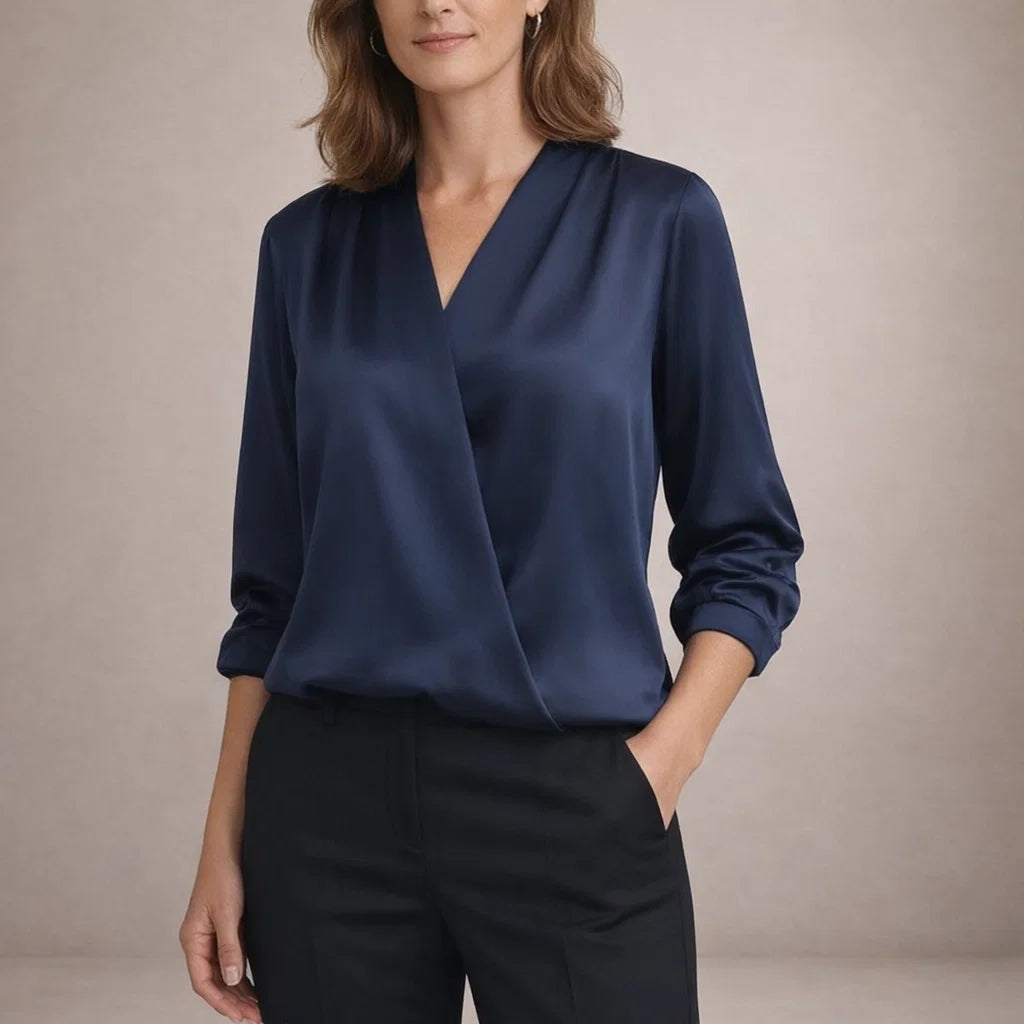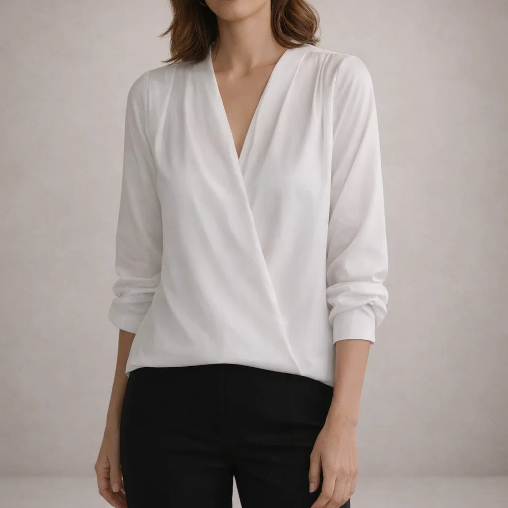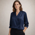 This women’s blouse features a V-neckline created by a wrap-style front panel. The design includes long sleeves with a smooth, fluid fabric appearance. The front overlaps at the centre, creating a clean draped effect. The blouse has a plain finish with minimal visible detailing.