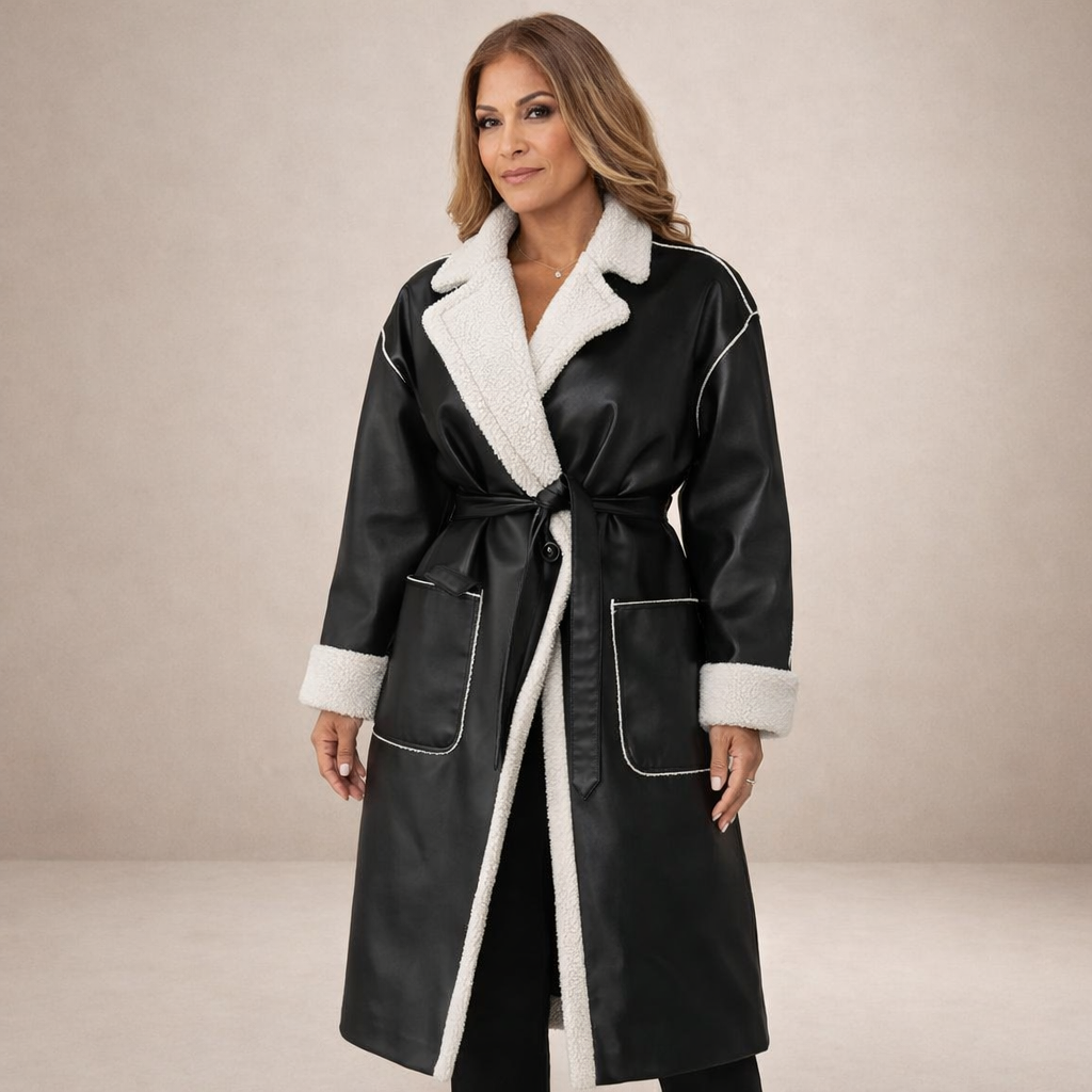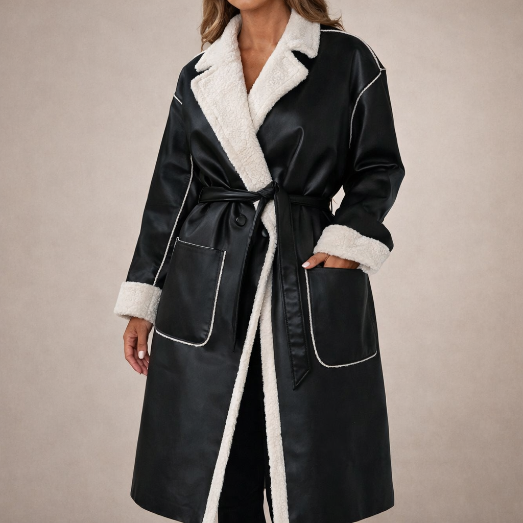 Design: Longline silhouette with wide lapels and a smooth outer finish contrasted by soft sherpa lining