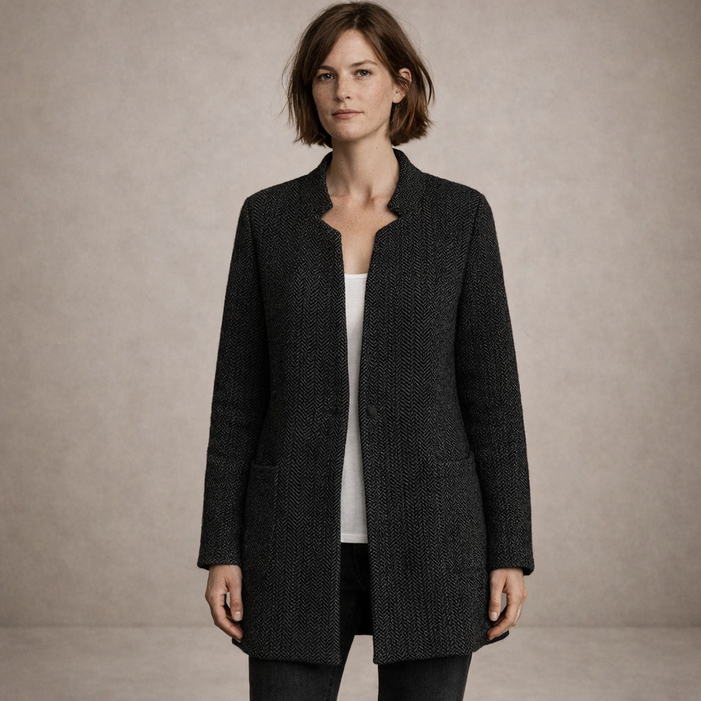 Design: Elegant longline silhouette featuring a subtle herringbone pattern for a classic, tailored appearance