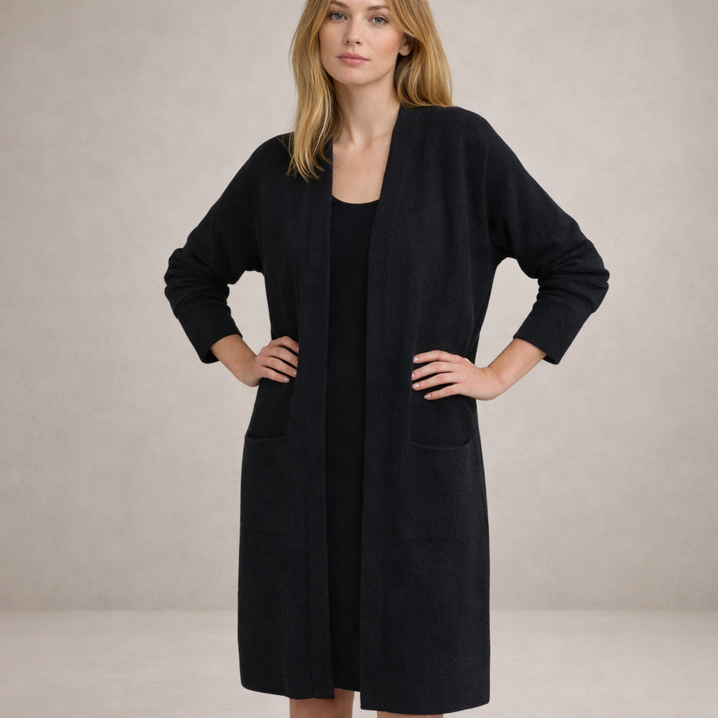 Design: Clean, open-front silhouette with a longline cut for a refined, understated appearance.