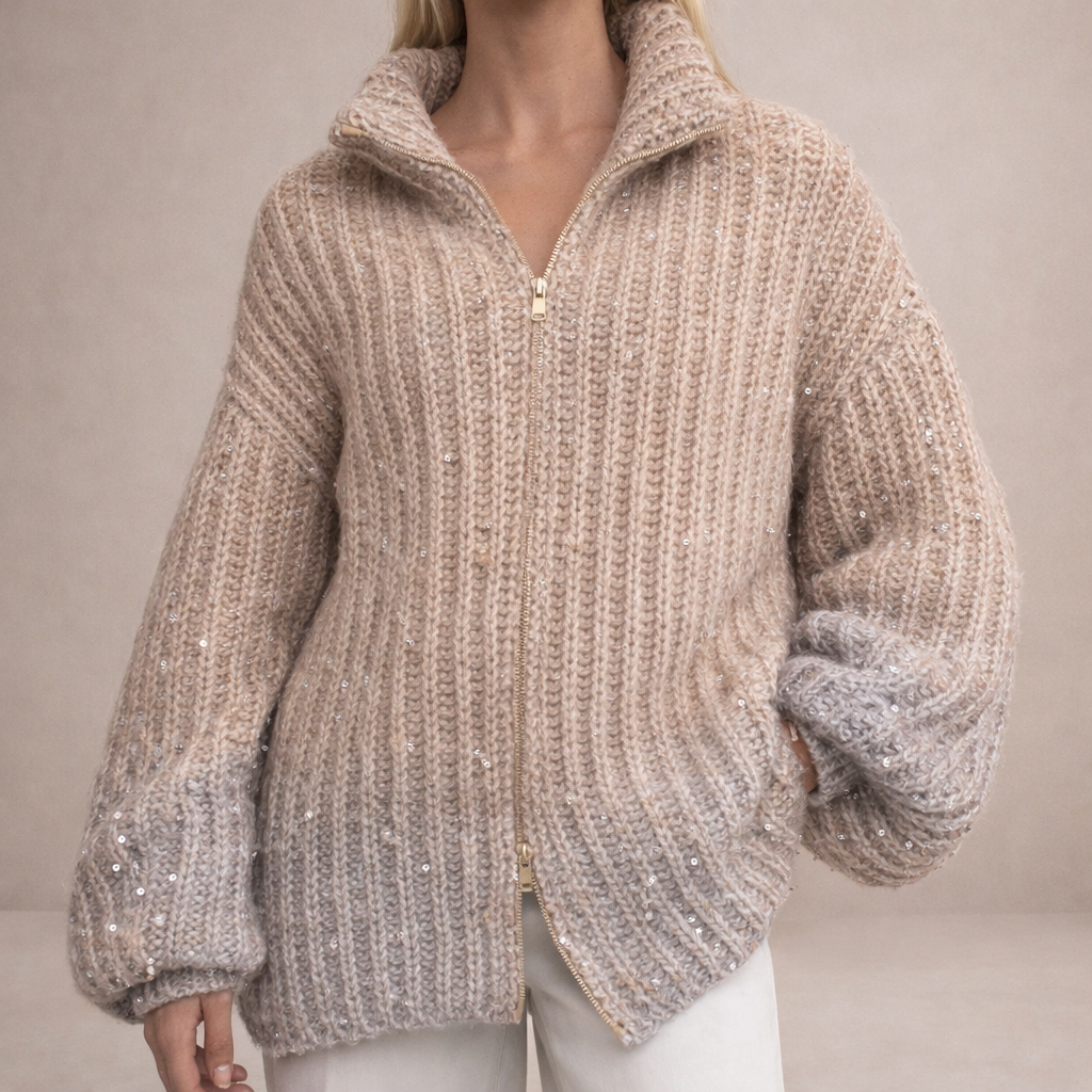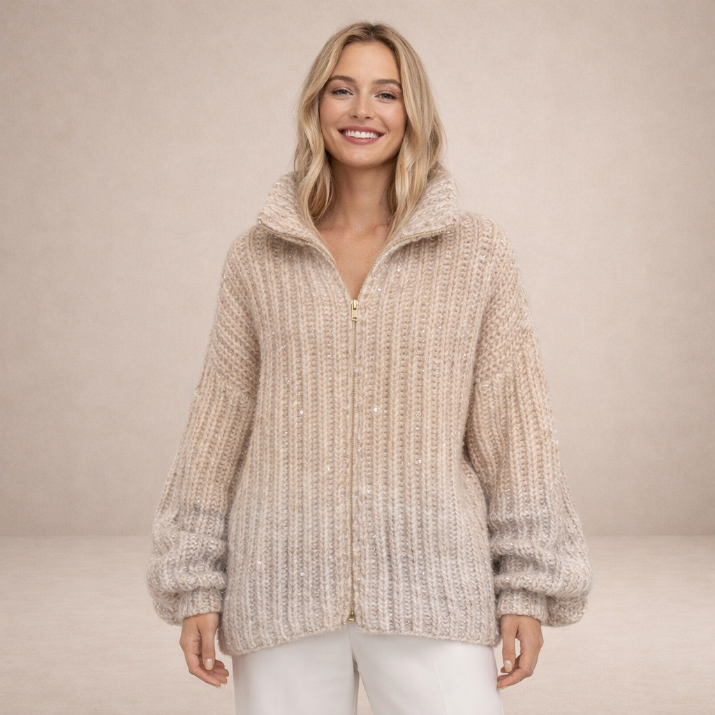Women’s Luxe Zip-Up Knit Sweater with Subtle Sparkle and Cozy Stand Collar