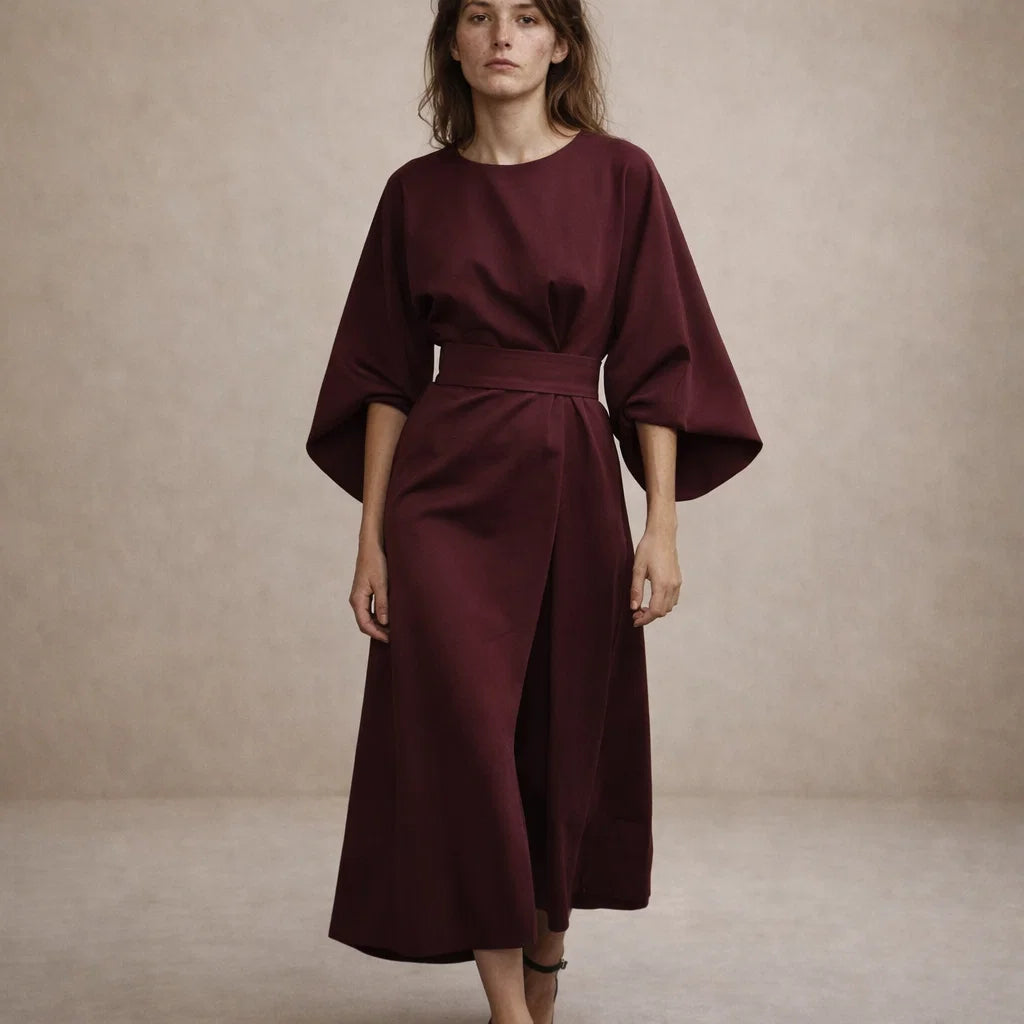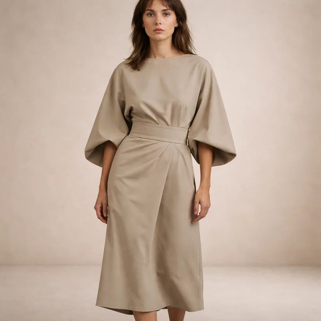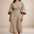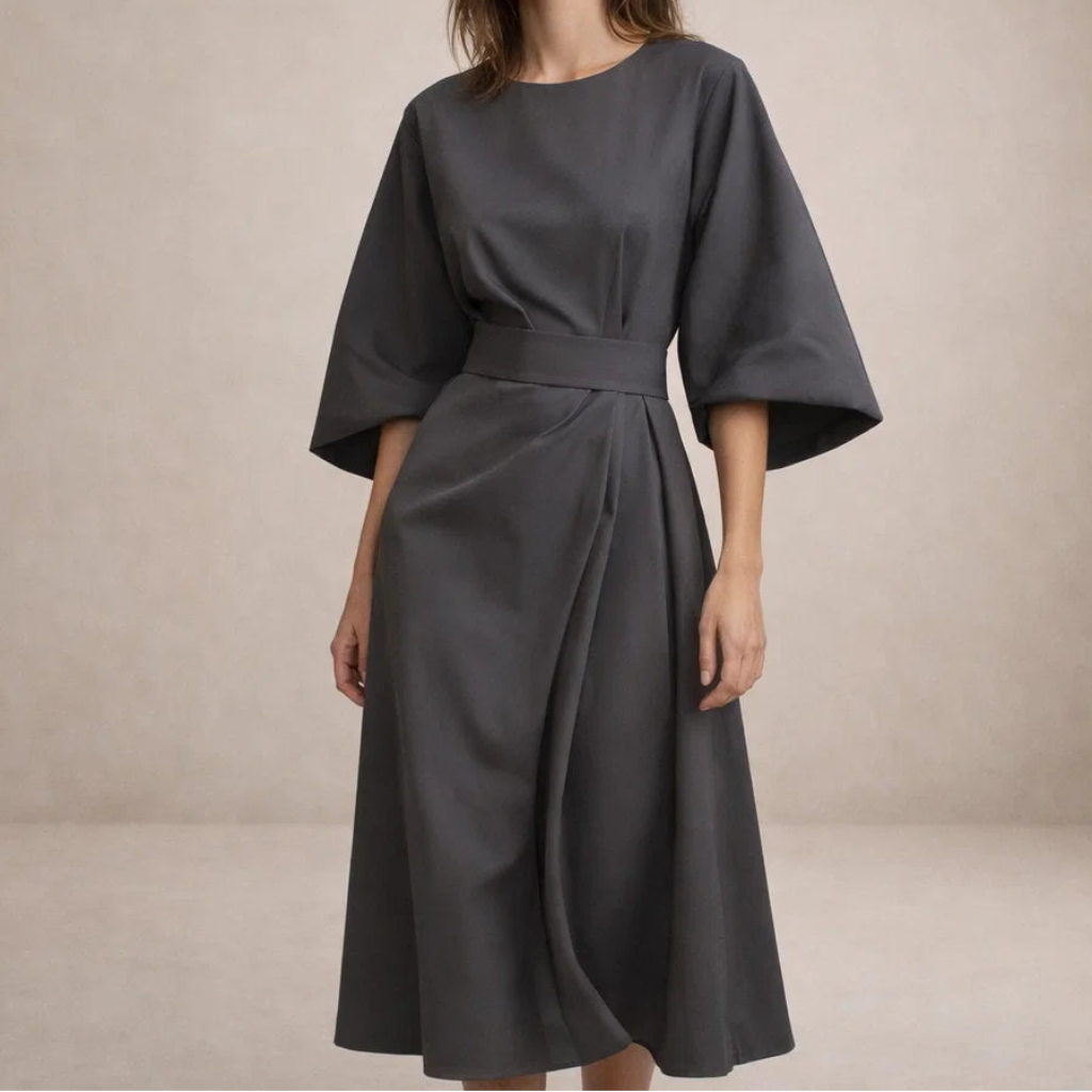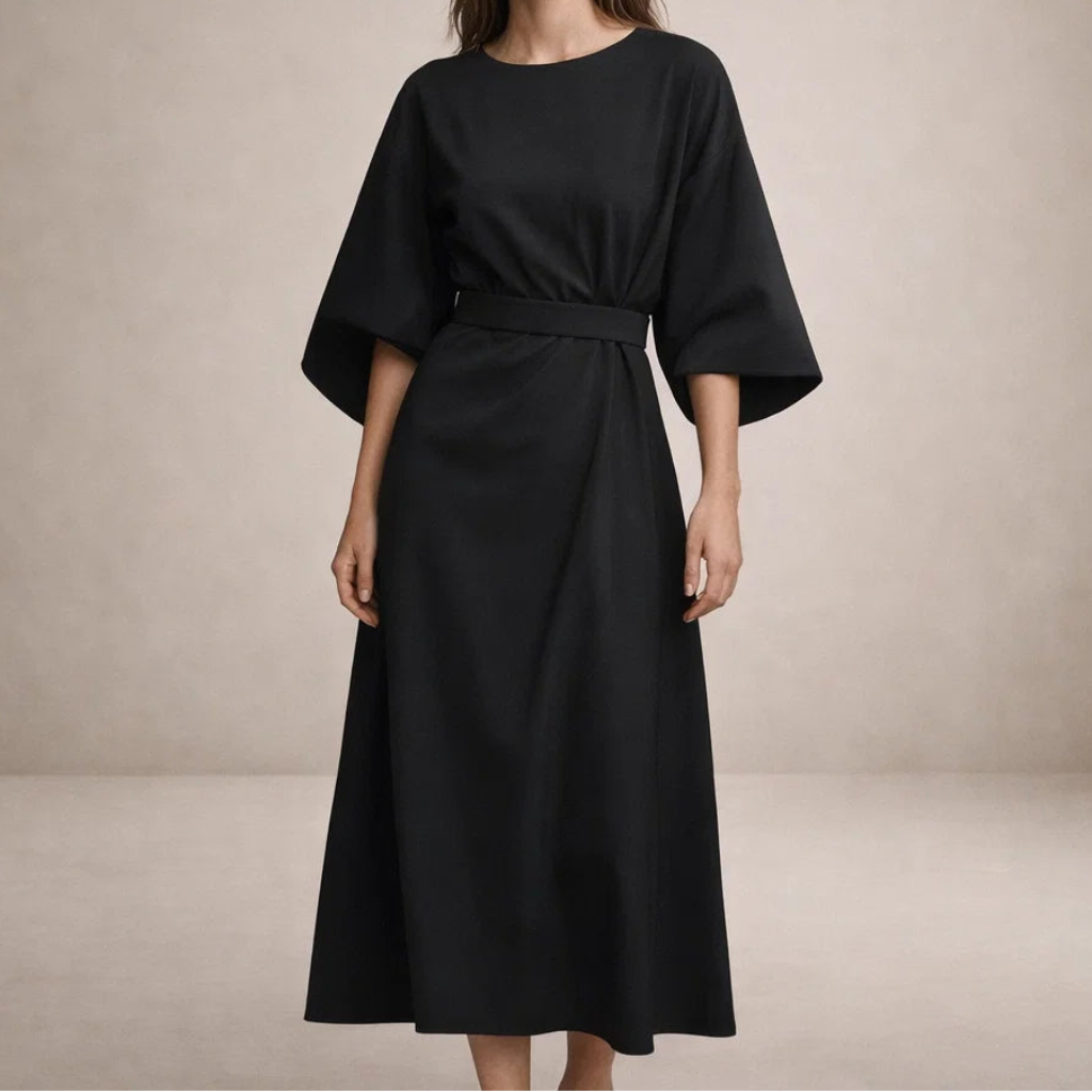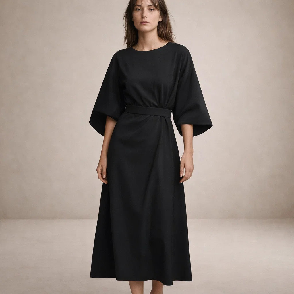 This women’s midi dress features a clean, modern silhouette with wide short sleeves and a softly cinched waist. Designed with a matching waist belt, it creates a flattering shape while maintaining a relaxed, elegant feel. The smooth, flowing fabric drapes beautifully, making it suitable for both everyday wear and more refined occasions.
