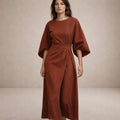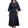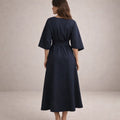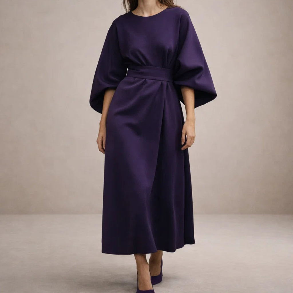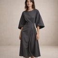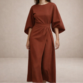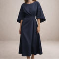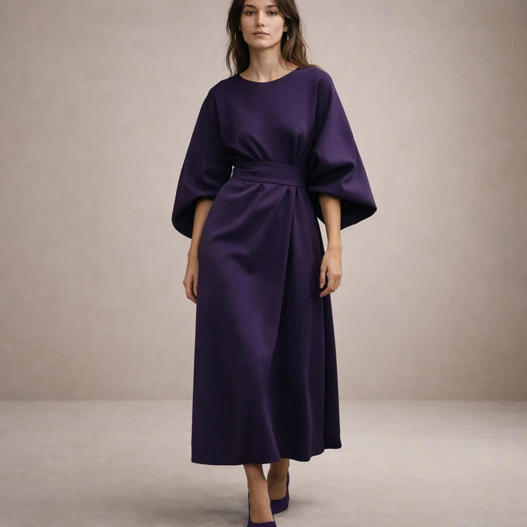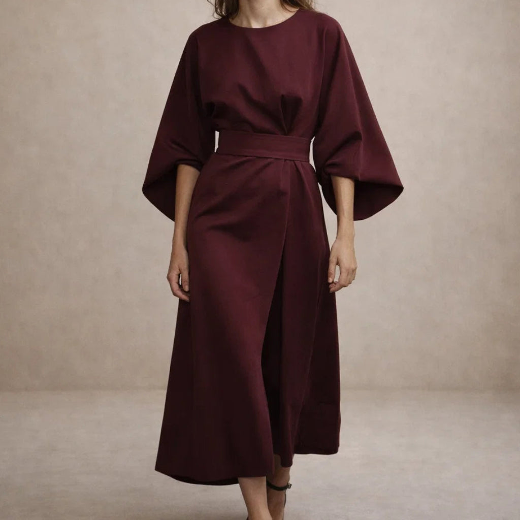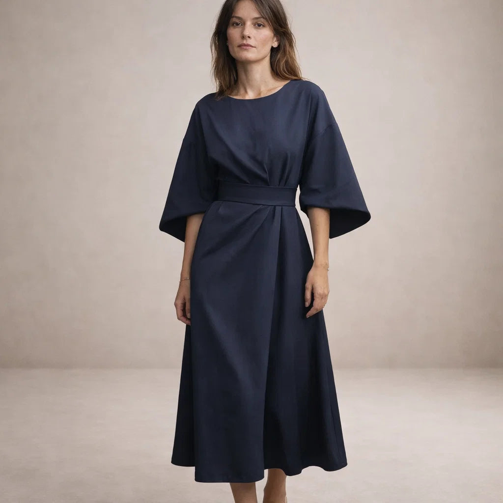 This women’s midi dress features a clean, modern silhouette with wide short sleeves and a softly cinched waist. Designed with a matching waist belt, it creates a flattering shape while maintaining a relaxed, elegant feel. The smooth, flowing fabric drapes beautifully, making it suitable for both everyday wear and more refined occasions.