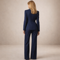This sophisticated navy pinstripe suit features a sharply tailored double-breasted blazer paired with matching straight-leg trousers. The blazer is designed with a structured silhouette, classic lapels and striking gold-tone buttons that add a refined, statement finish. Fine vertical pinstripes enhance the elongated look, while the coordinating trousers complete the ensemble with a clean, polished line. Ideal for business, formal occasions or power dressing, this suit combines timeless tailoring with modern elegance.