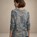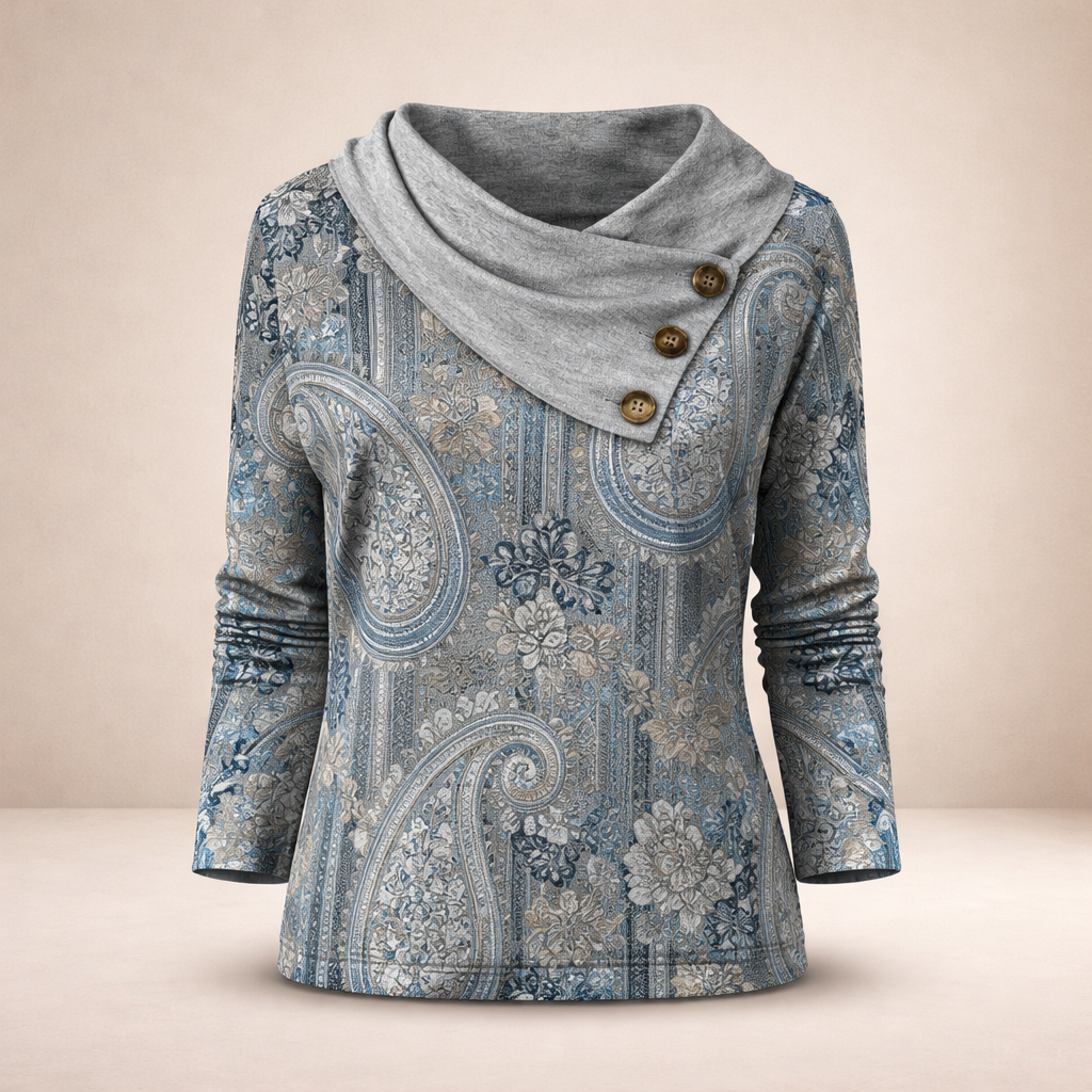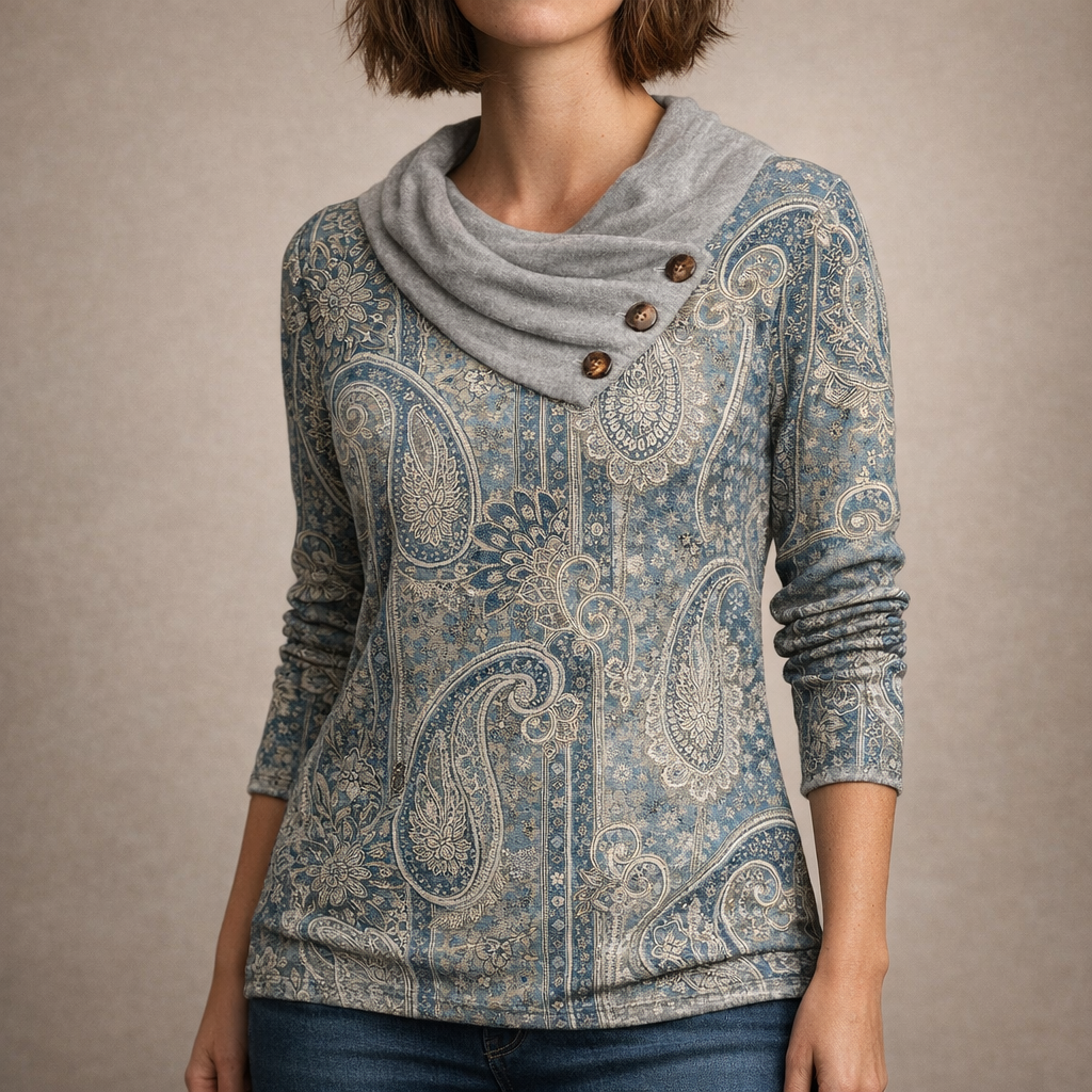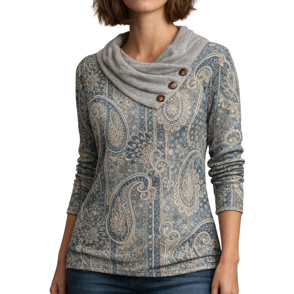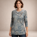 Women’s Paisley Print Long Sleeve Top with Button Cowl Neck Blue Grey