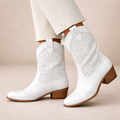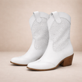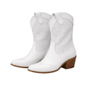 Fresh and contemporary, these Women’s Perforated Western Boots with Block Heel bring a modern twist to classic cowboy styling. The crisp white finish and breathable detailing make them a standout choice for warmer days, while the structured silhouette keeps the look polished. Ideal for festivals, weekend outings or elevating everyday denim.