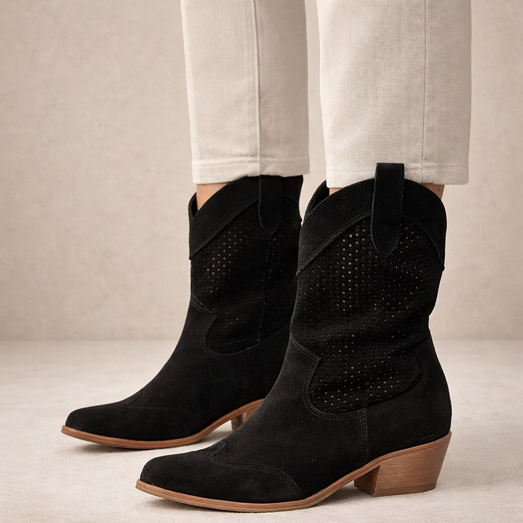 Women’s Perforated Western Ankle Boots with Block Heel and Pull Tabs