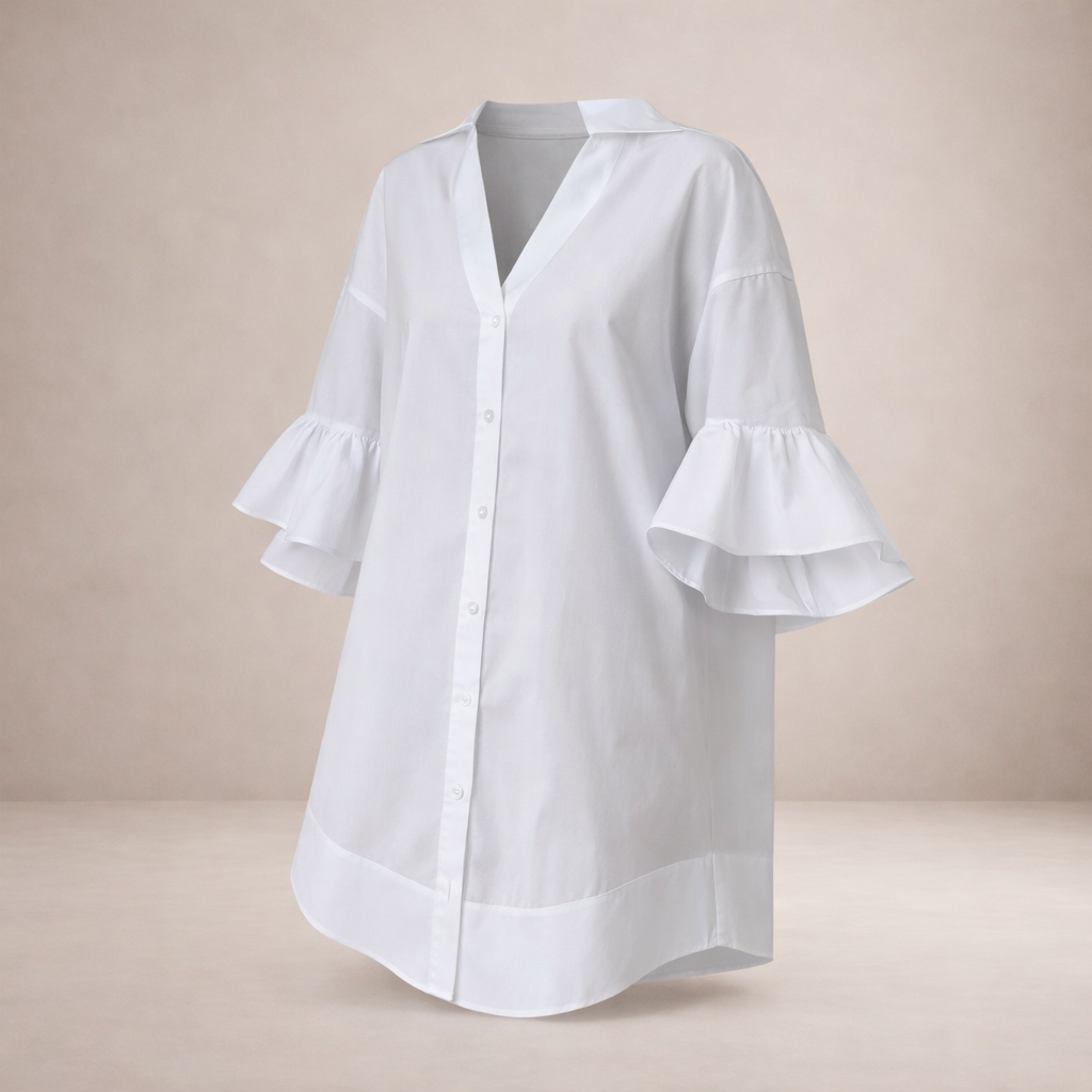 Details: Softly flared ruffle sleeves, neat collar, and gently curved hem for added femininity