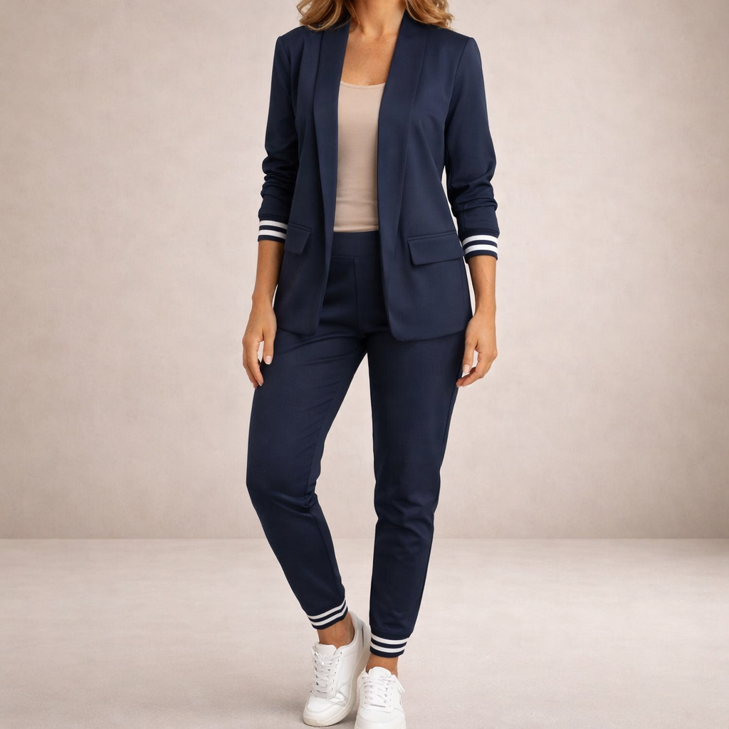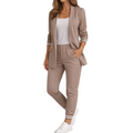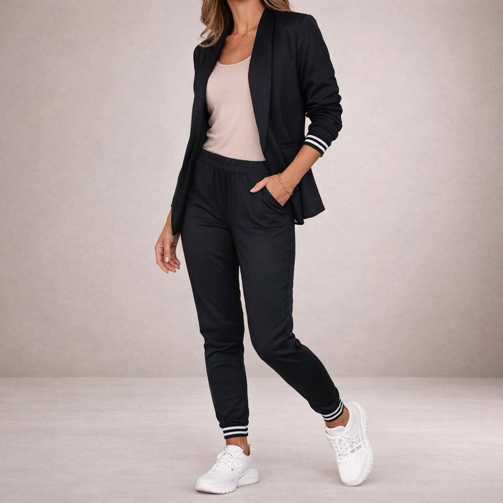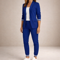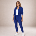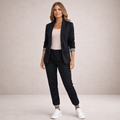 Details: Open-front blazer with structured lapels and elasticated waistband trousers with practical side pockets